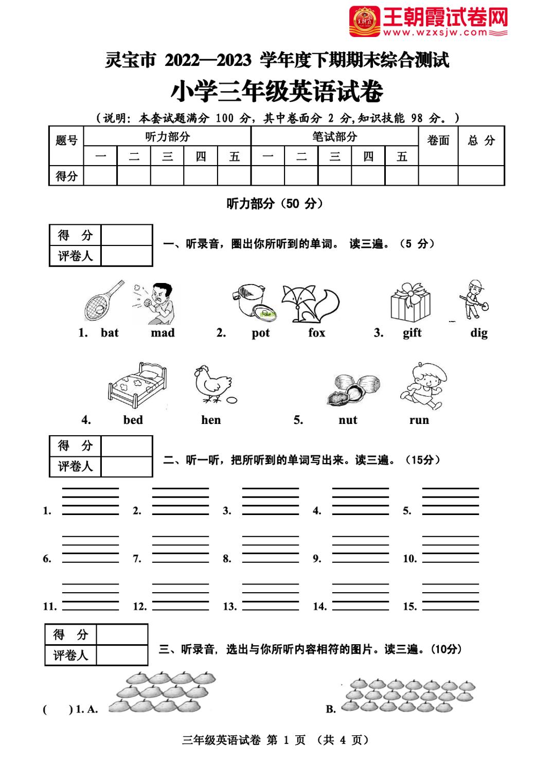 河南省三门峡市灵宝市2022—2023学年下学期期末综合测试三年级英语(人教PEP版)【无听力音频】