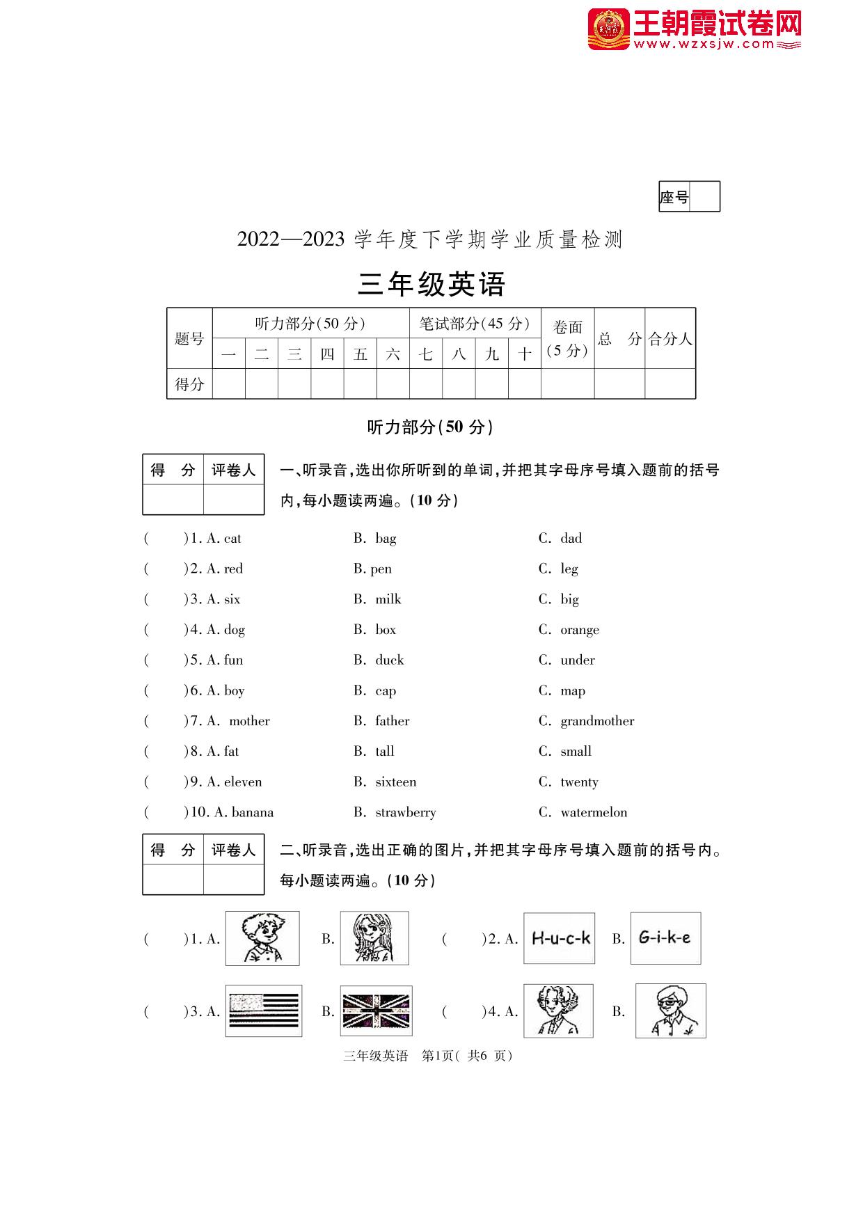 河南省郑州市巩义市2022—2023学年下学期学业质量检测三年级英语(人教PEP版)【无听力音频】