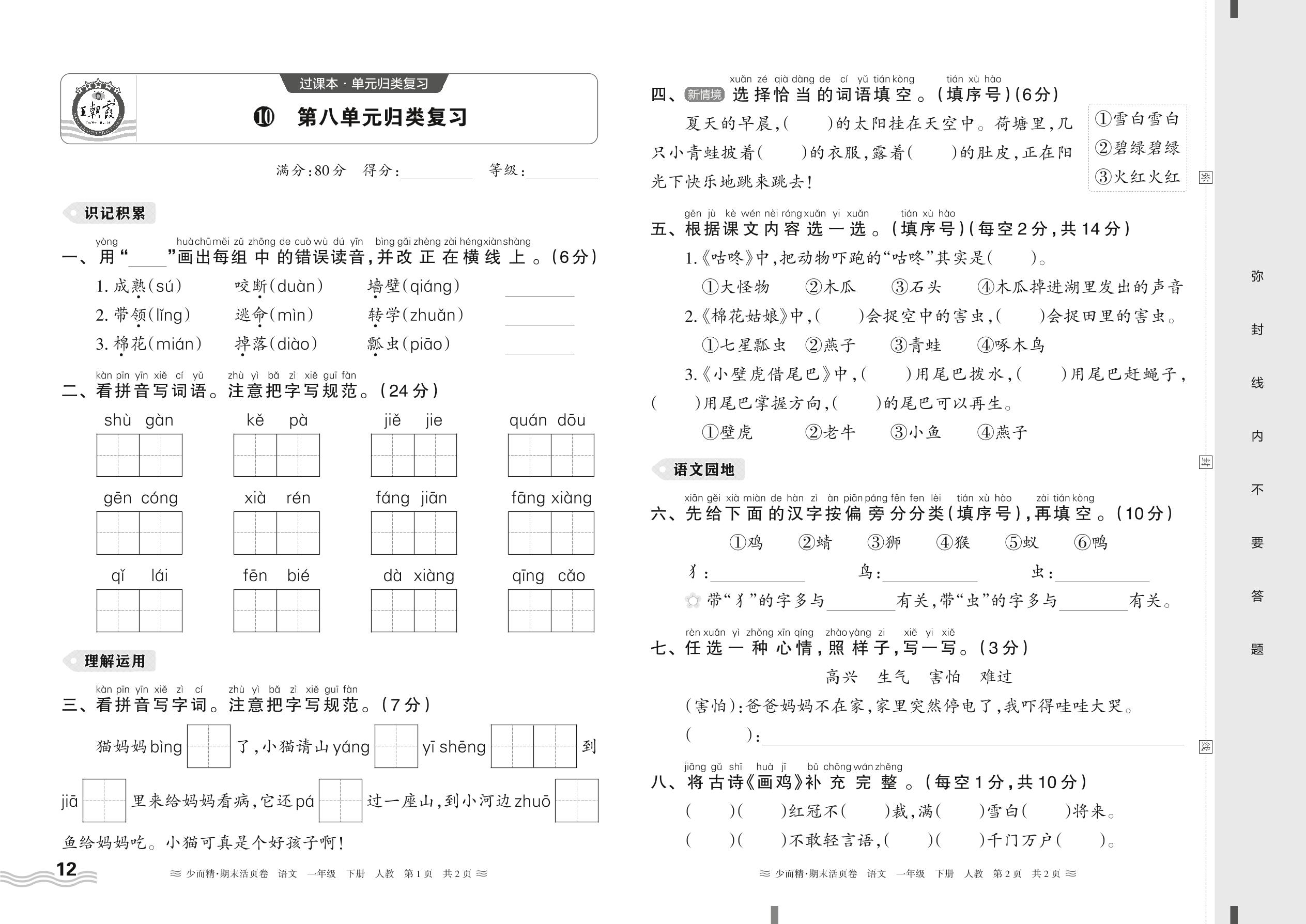 2024春下册一年级语文人教版 期末过课本HY版·第八单元归类复习