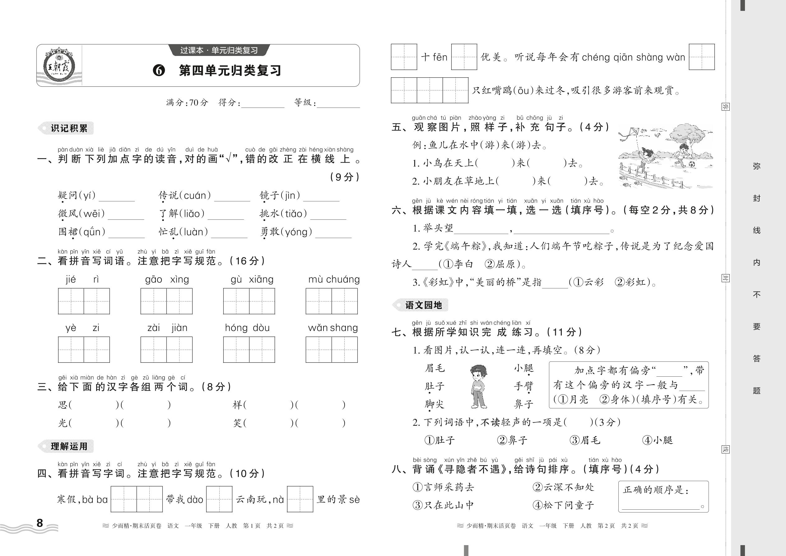 2024春下册一年级语文人教版 期末过课本HY版·第四单元归类复习