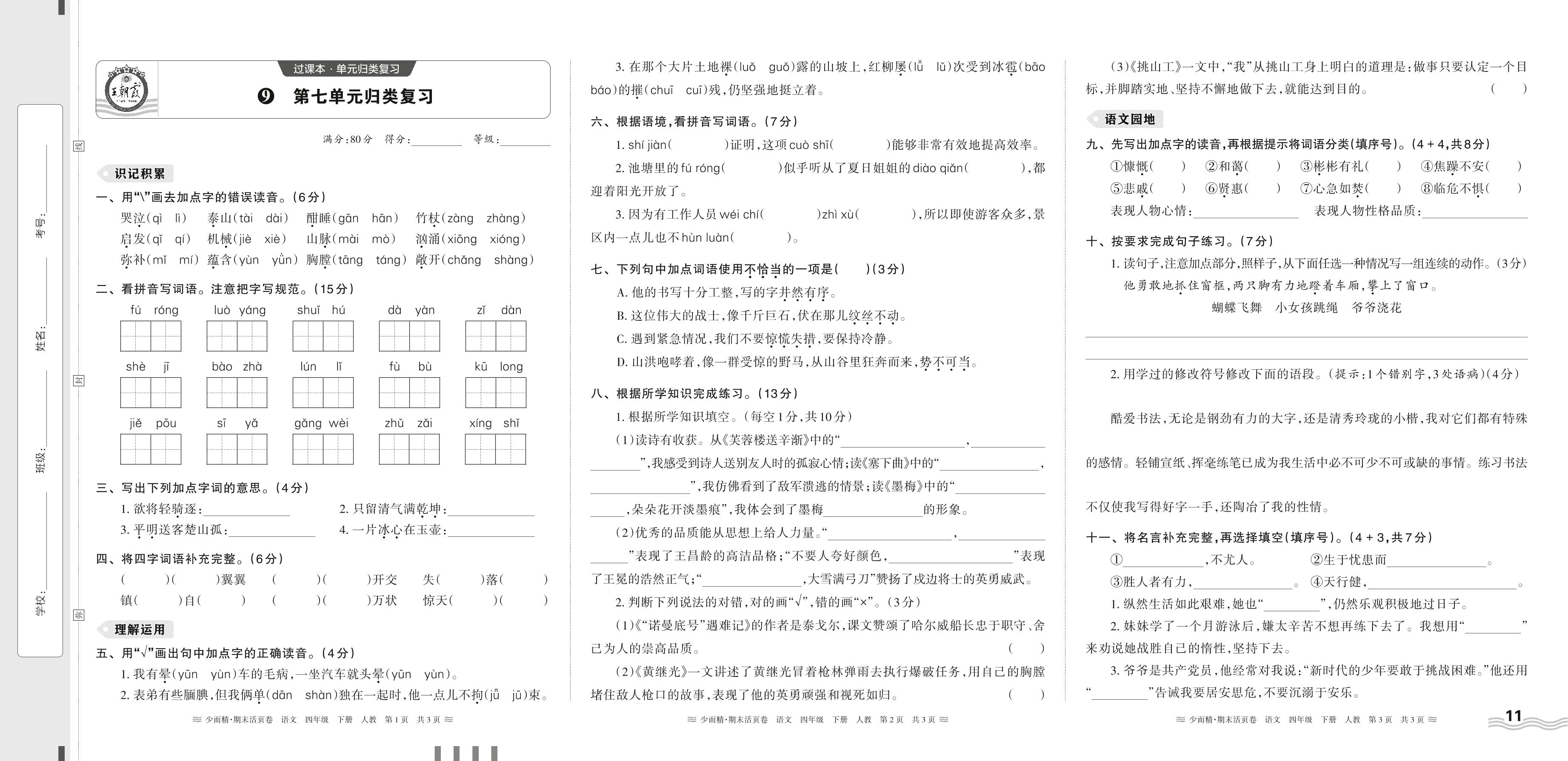 2024春下册四年级语文人教版 期末过课本HY版·第七单元归类复习