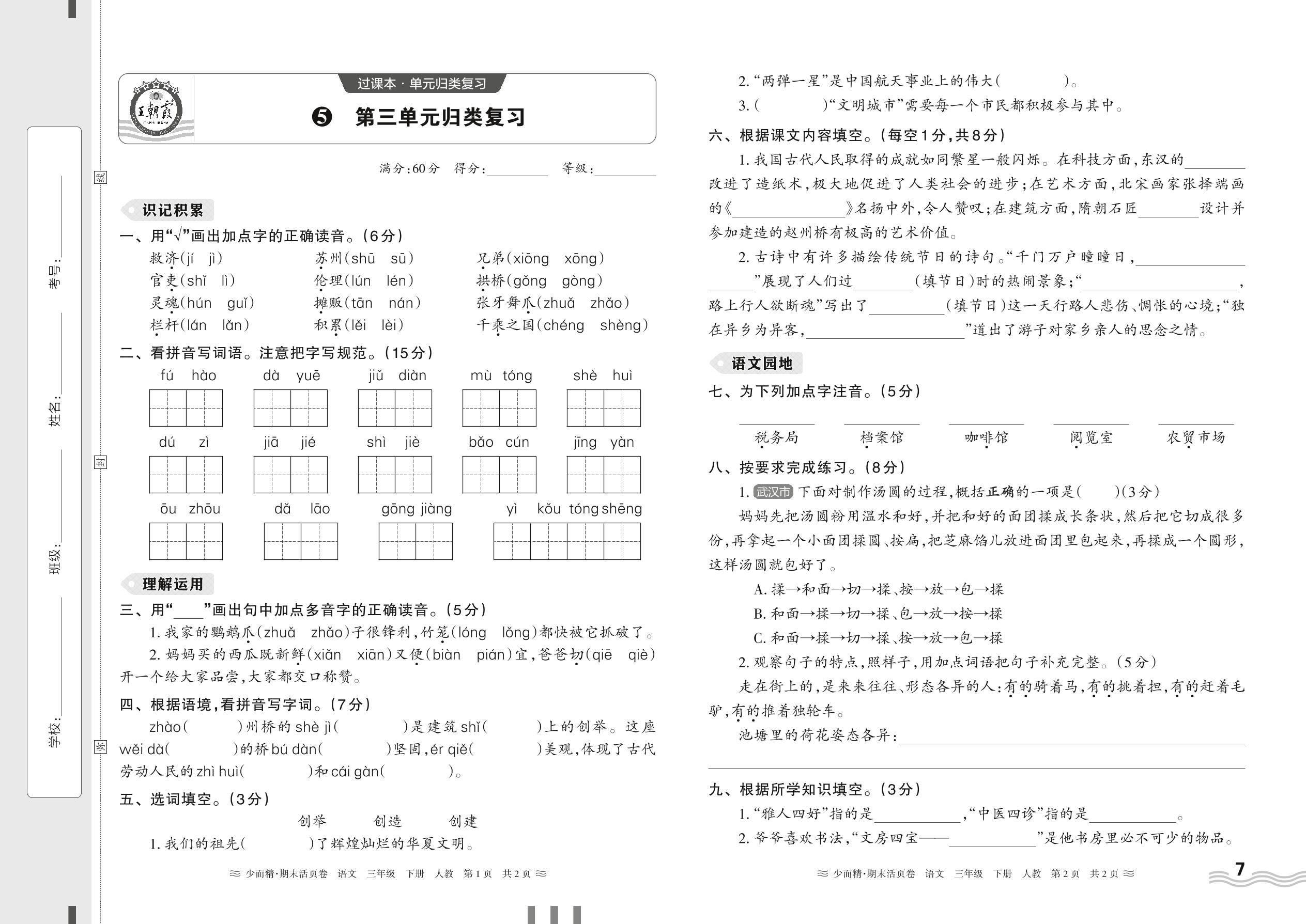 2024春下册三年级语文人教版 期末过课本HY版·第三单元归类复习