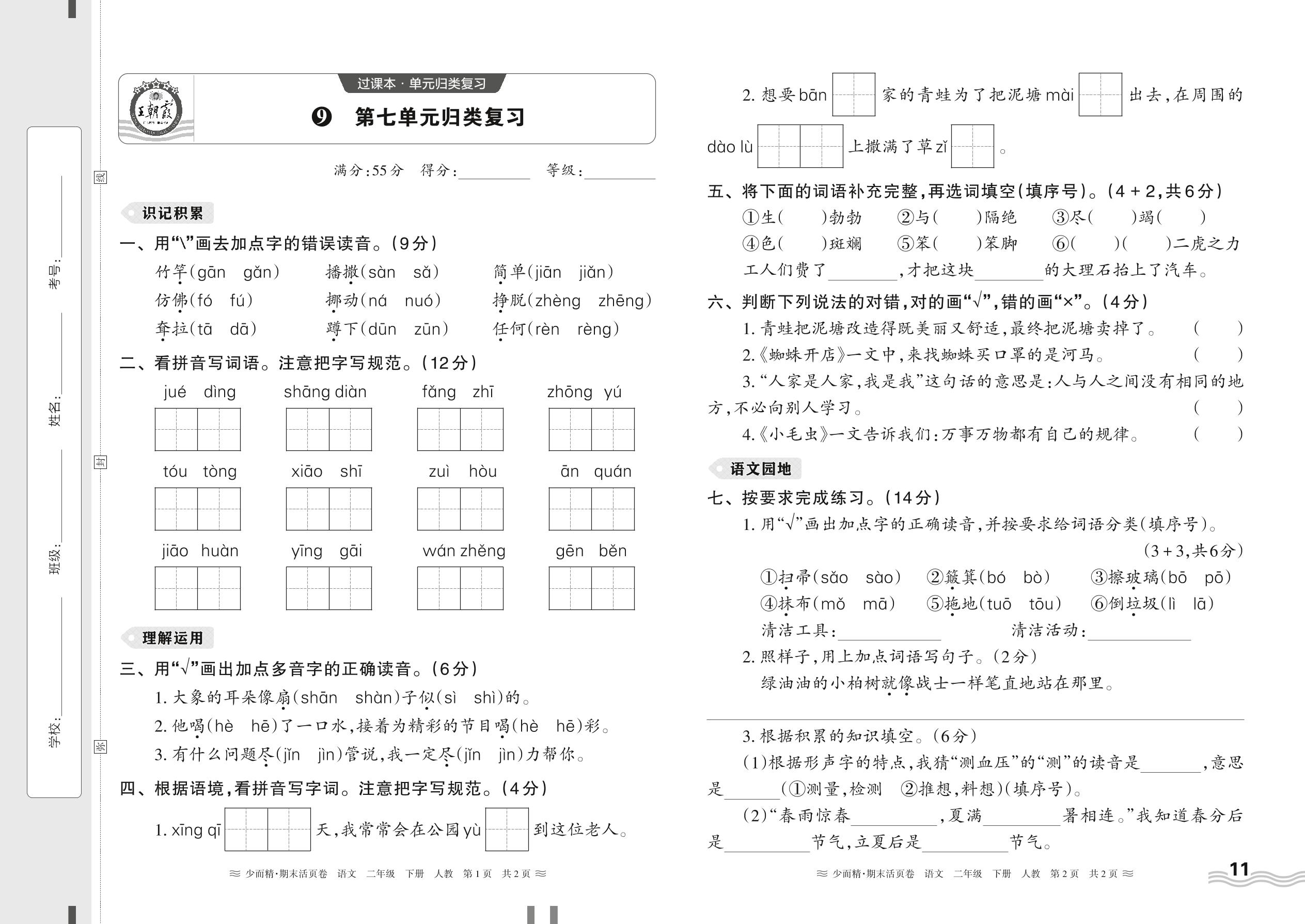 2024春下册二年级语文人教版 期末过课本HY版·第七单元归类复习