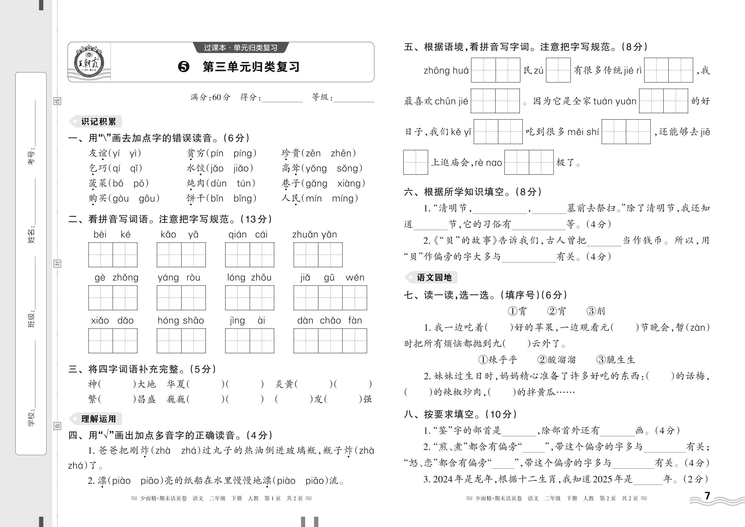 2024春下册二年级语文人教版 期末过课本HY版·第三单元归类复习