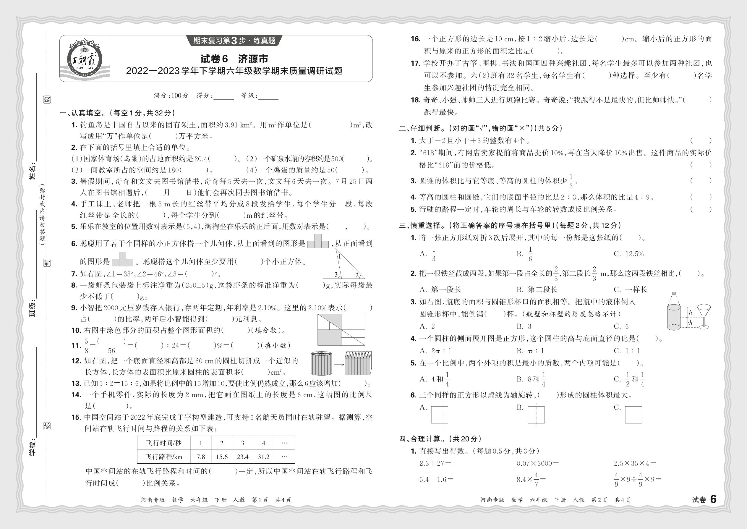 河南省济源市2022—2023学年下期六年级数学期末质量调研试题(人教版)【6】