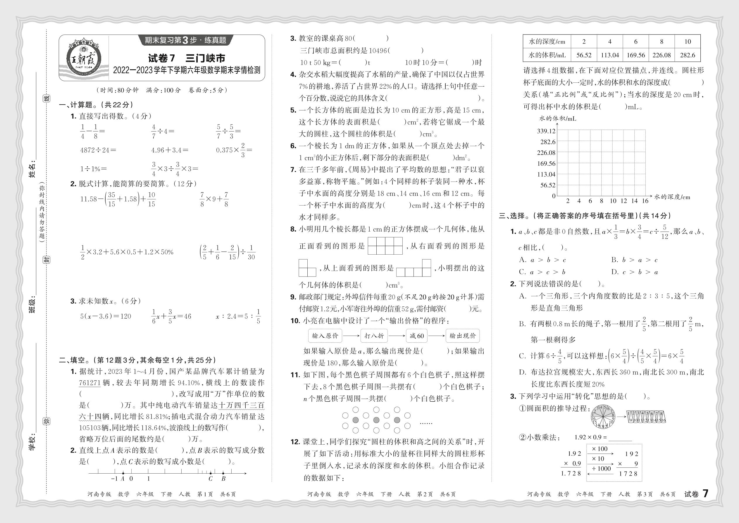 河南省三门峡市2022—2023学年下学期六年级数学期末学情检测(人教版)【7】