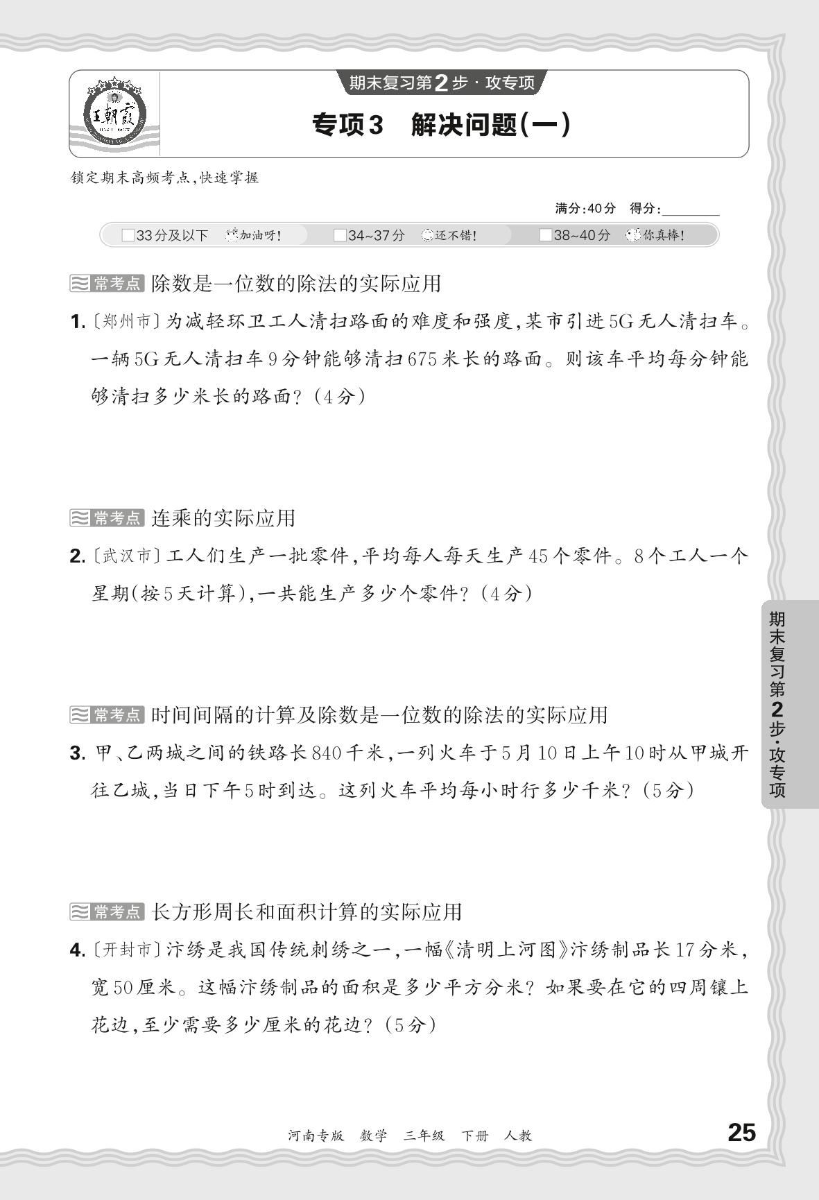 2024春下册三年级数学人教版 期末专项卷河南版·解决问题(一)
