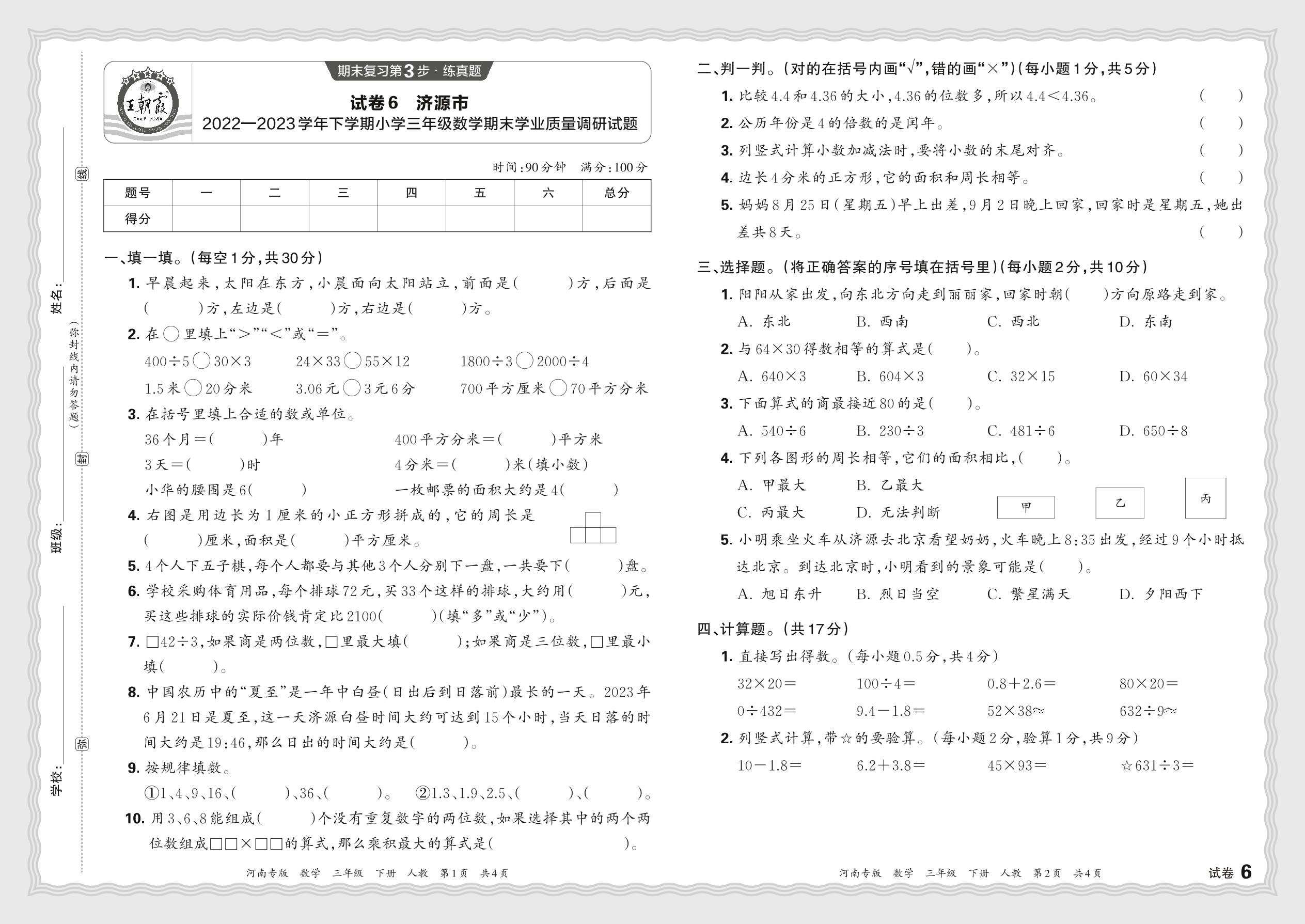 河南省济源市2022—2023学年下期小学三年级数学期末质量调研试题(人教版)【6】
