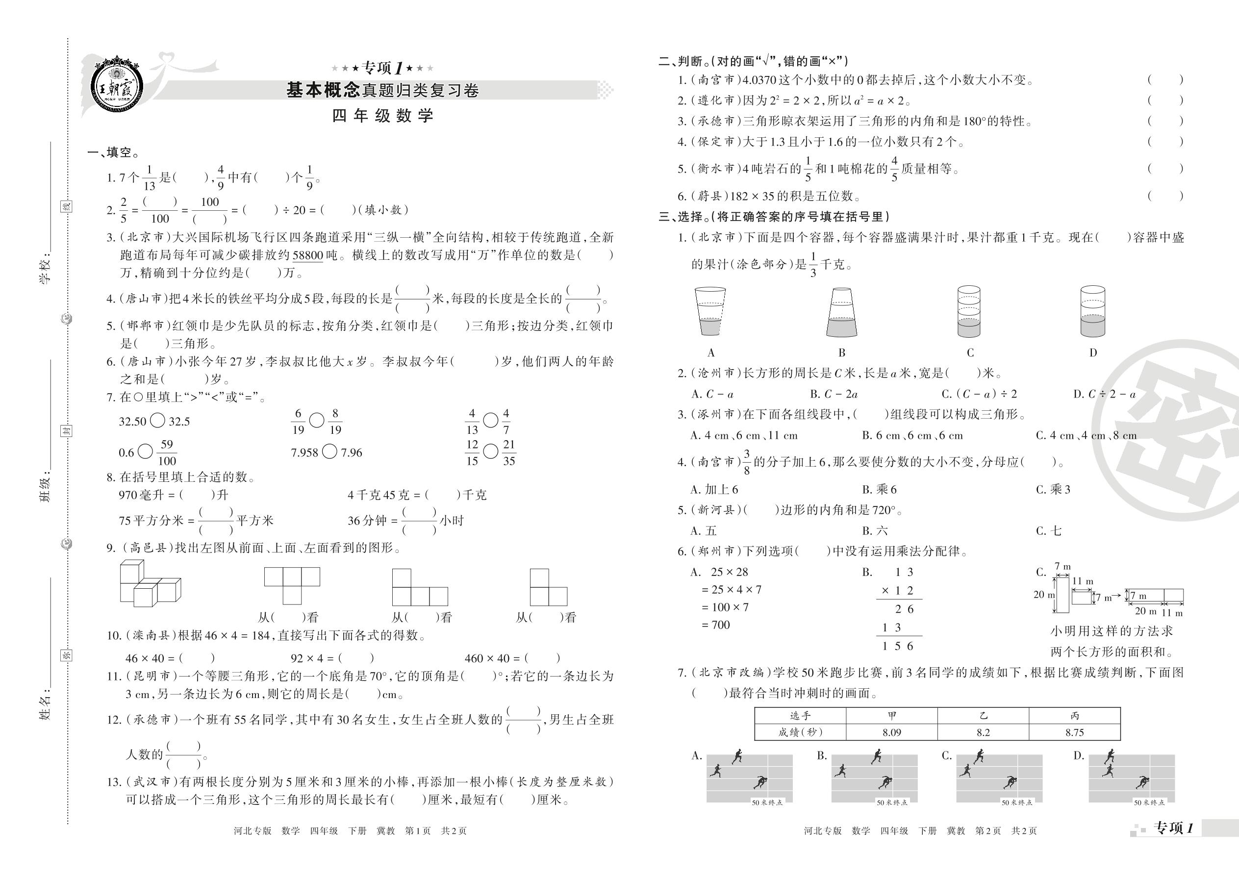 王朝霞期末专项卷——基本概念、计算真题归类复习四年级下册数学(冀教版)【0】