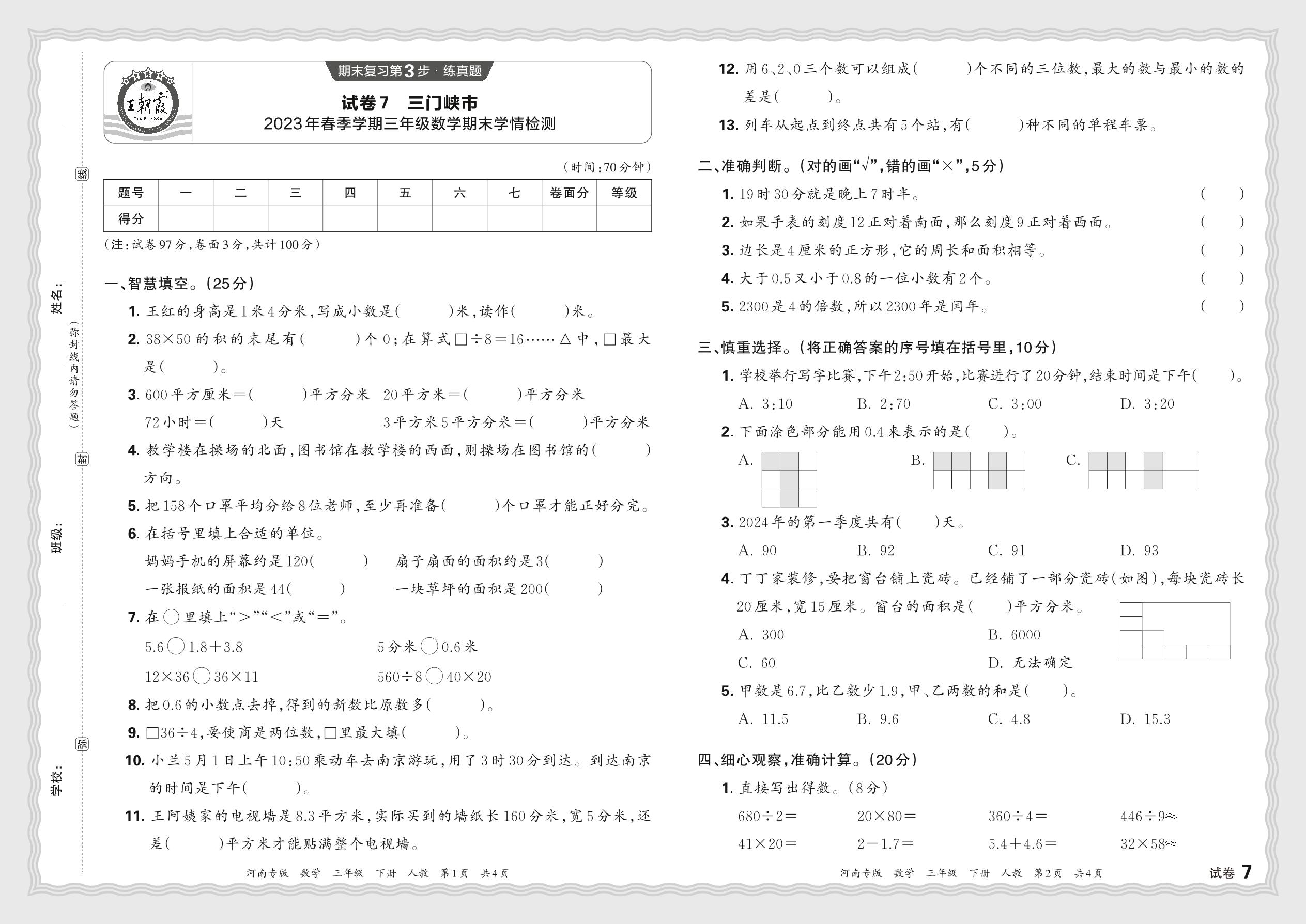 河南省三门峡市2023年春季三年级数学期末学情检测(人教版)【7】