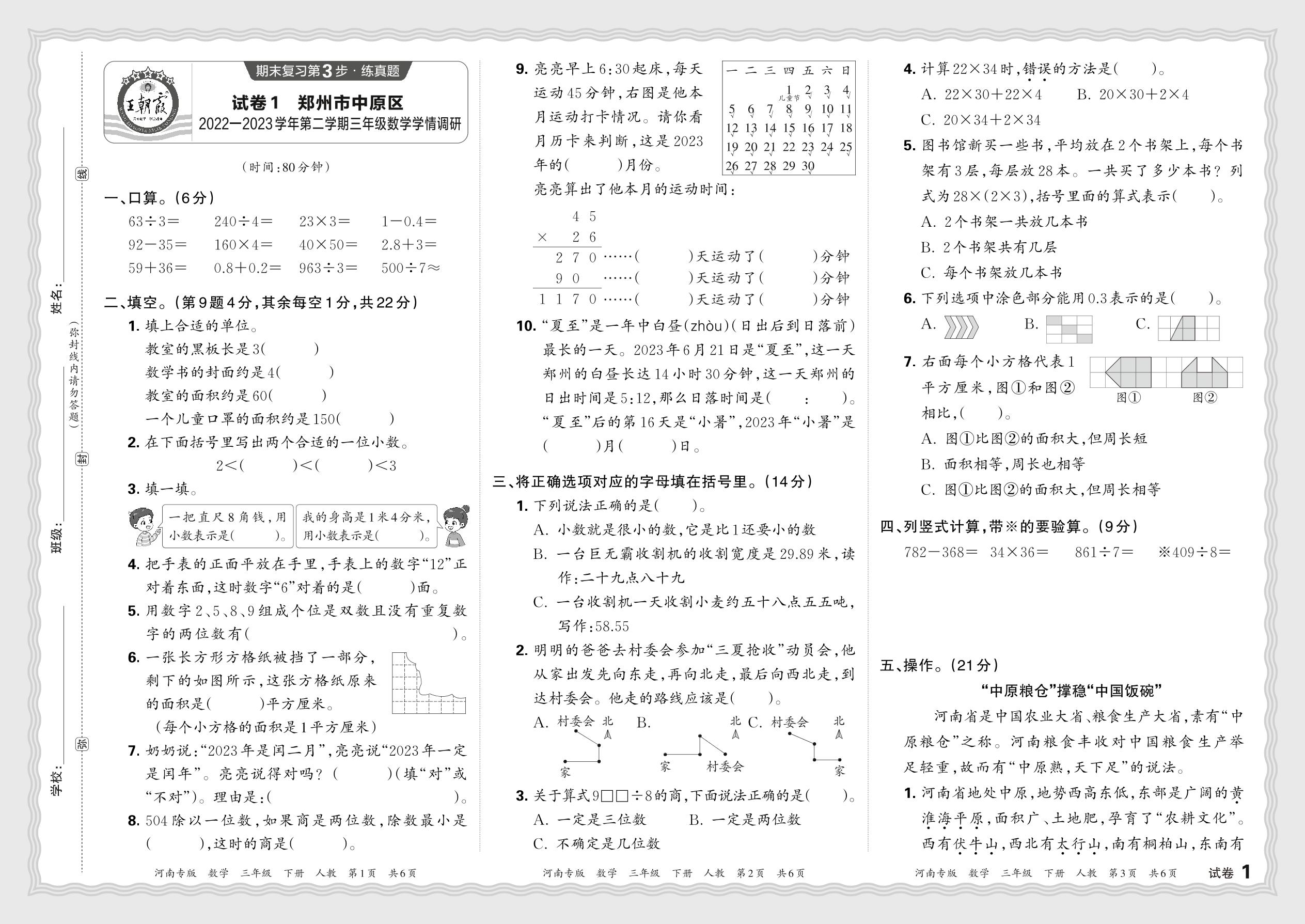 河南省郑州市中原区2022—2023学年第二学期三年级数学学情调研(人教版)【1】