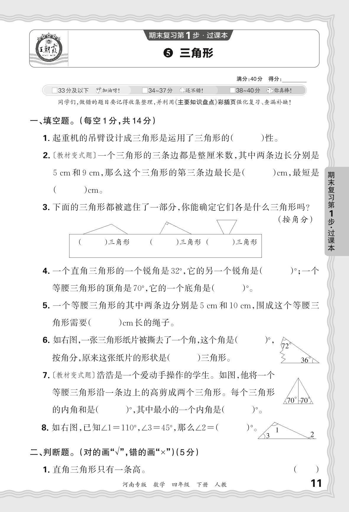 2024春下册四年级数学人教版 期末过课本河南版·三角形