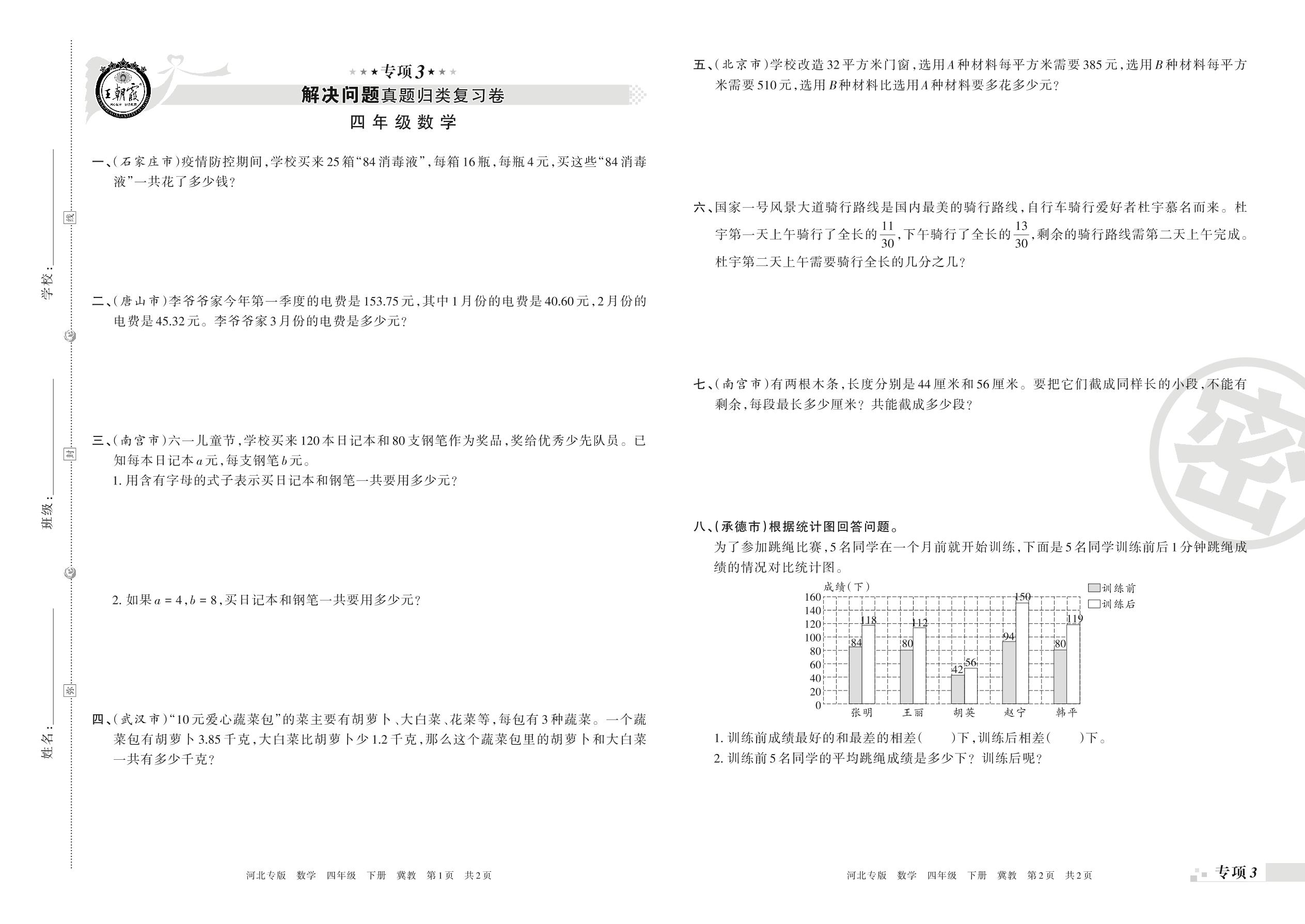 王朝霞期末专项卷——解决问题真题归类复习、新颖题速递:生活与数学四年级下册数学(冀教版)【0】