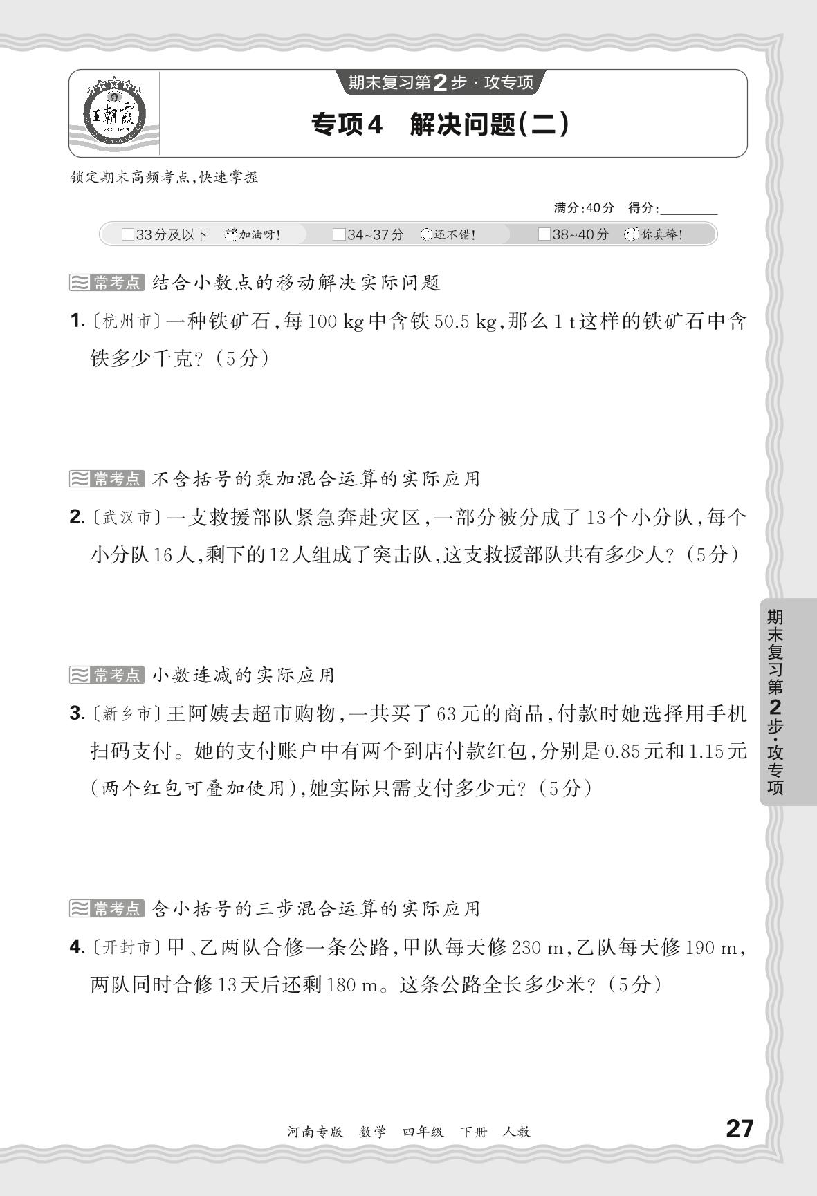 2024春下册四年级数学人教版 期末专项卷河南版·解决问题(二)