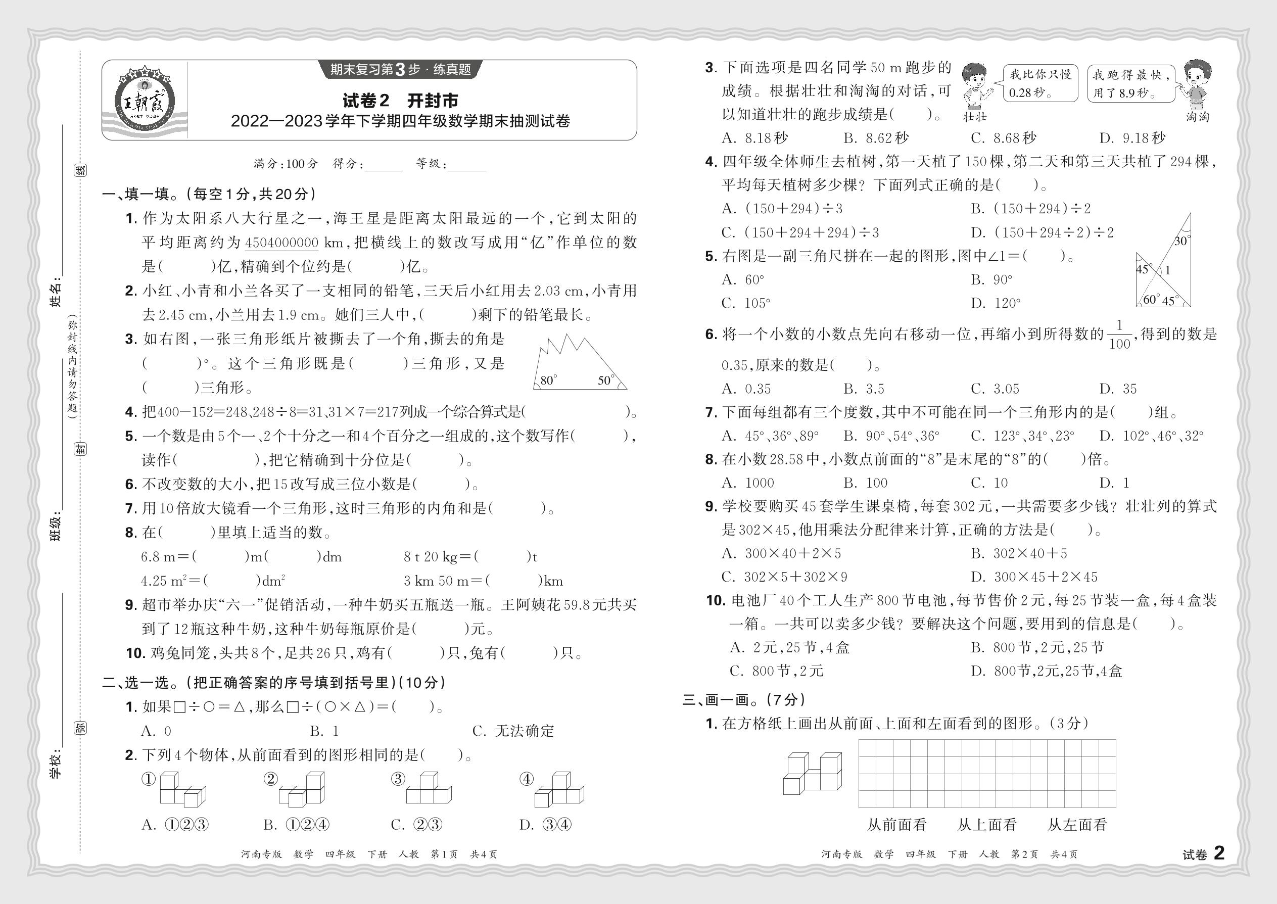 河南省开封市义务教育教科书下期四年级数学期末抽测试卷(人教版)【2】
