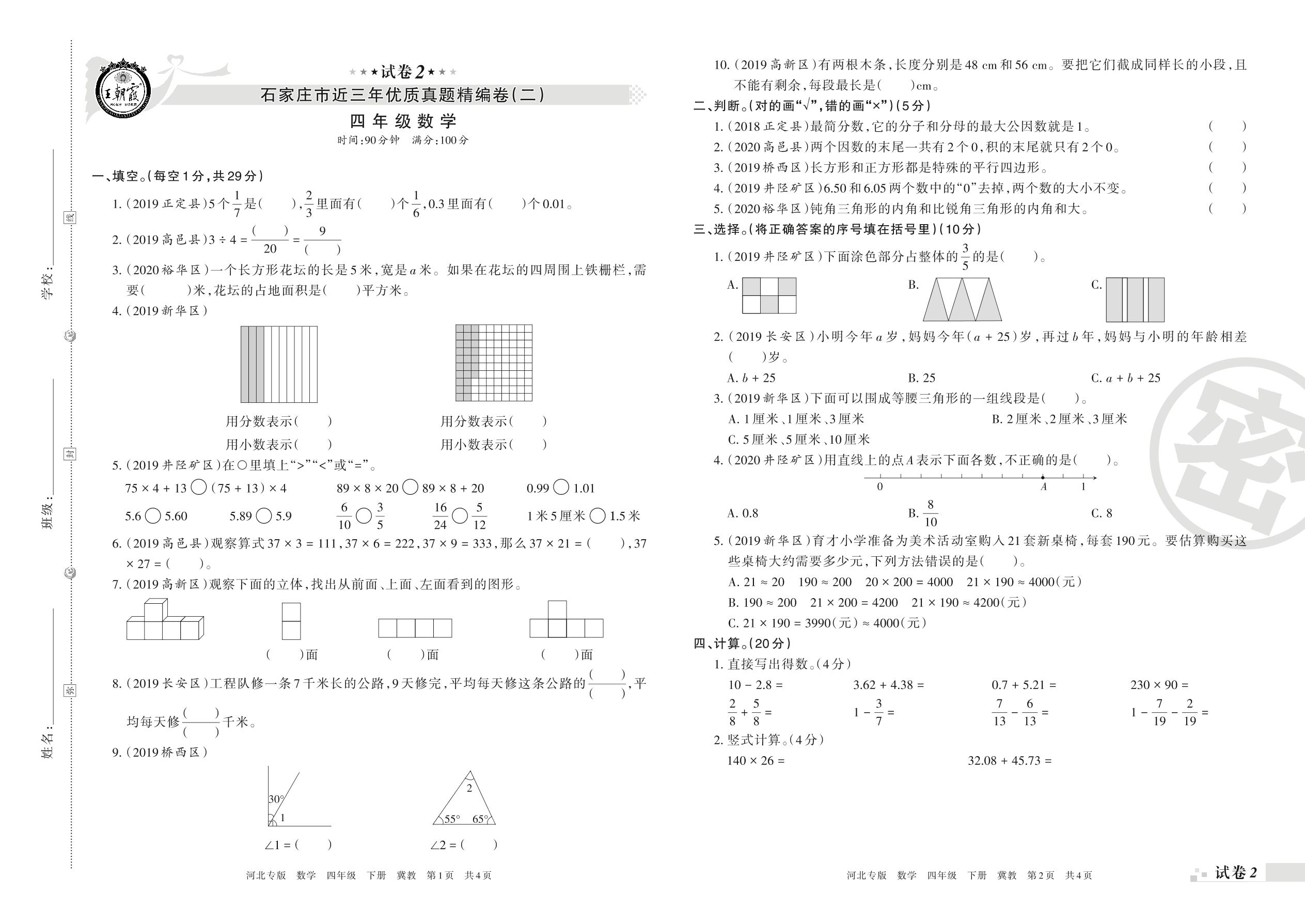 石家庄市近三年优质真题精编卷(二)四年级下册数学(冀教版)【2】