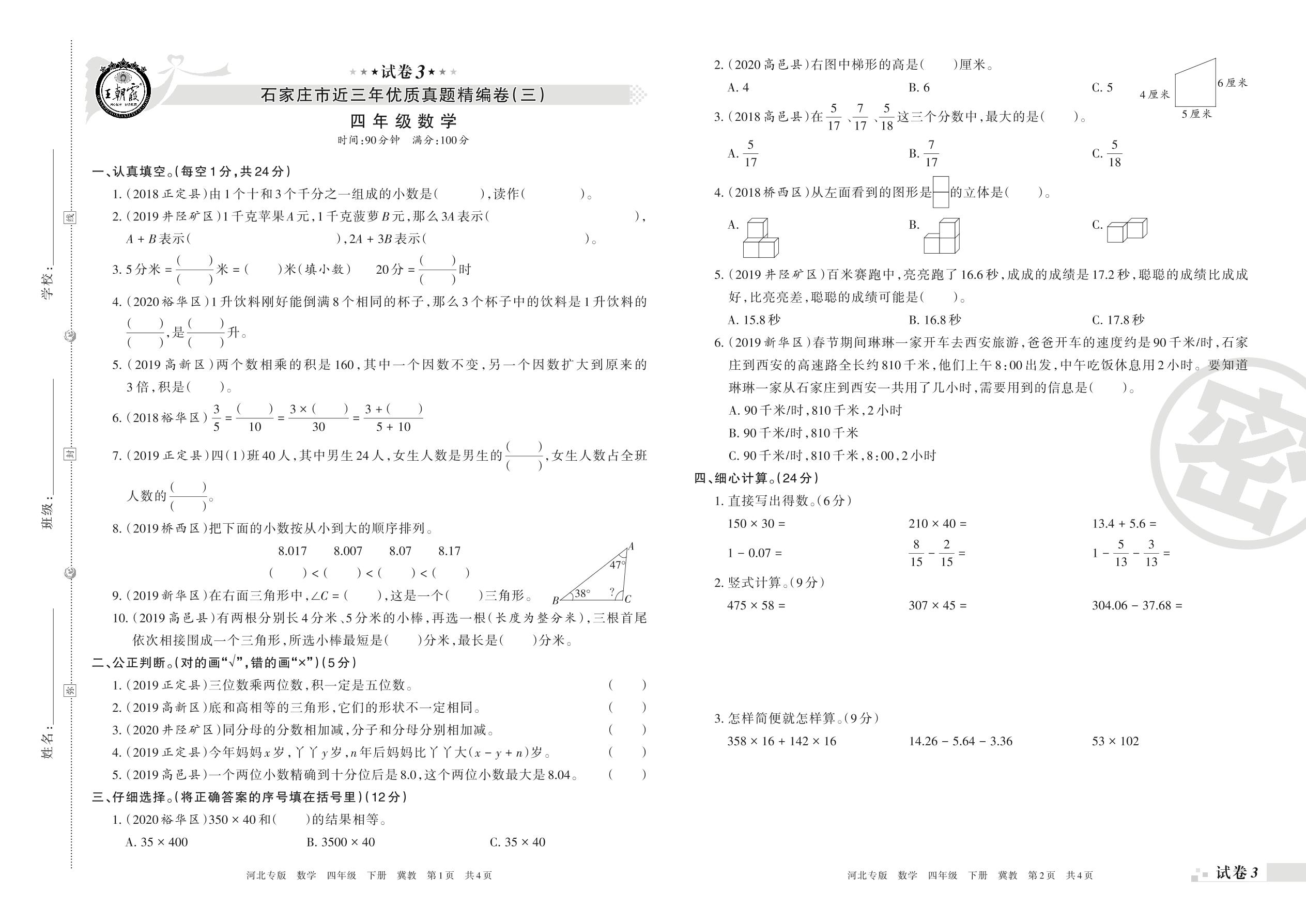 石家庄市近三年优质真题精编卷(三)四年级下册数学(冀教版)【3】