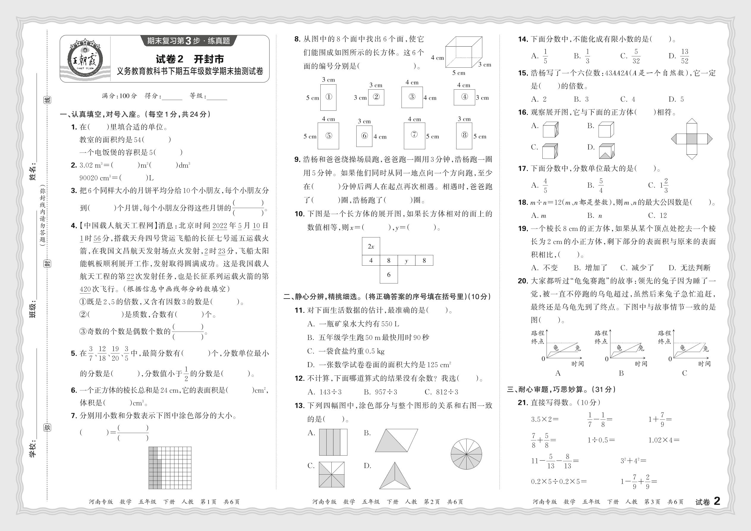 河南省开封市义务教育教科书下期五年级数学期末抽测试卷(人教版)【2】