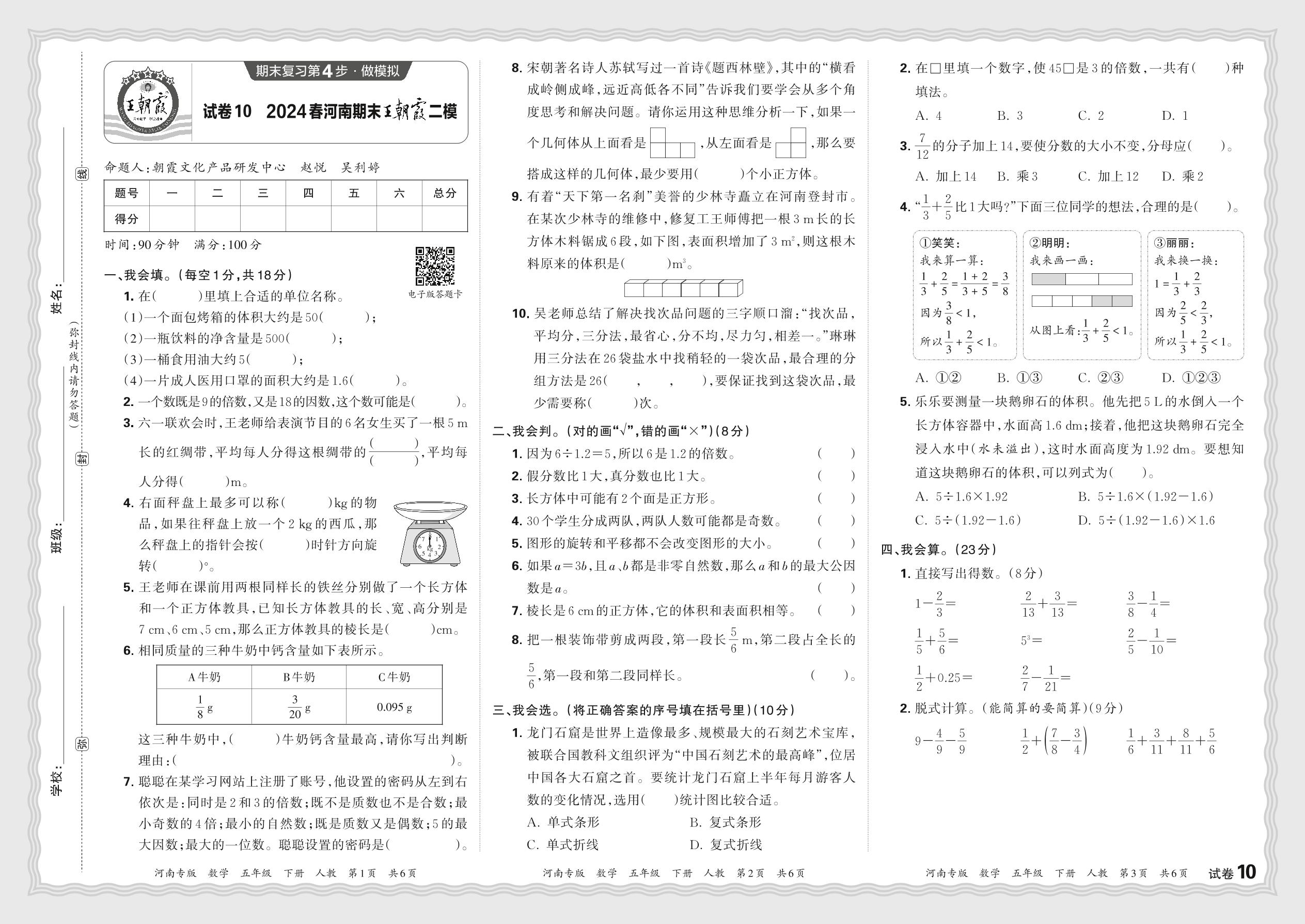 2024春下册五年级数学人教版 河南期末王朝霞二模