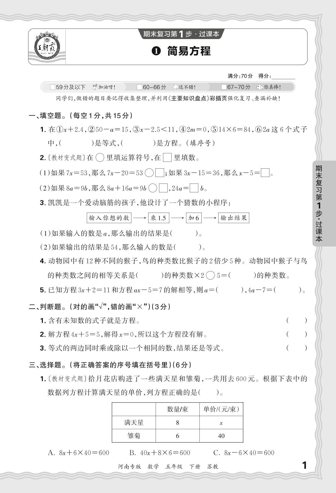 2024春下册五年级数学苏教版 期末过课本河南版·简易方程【1】