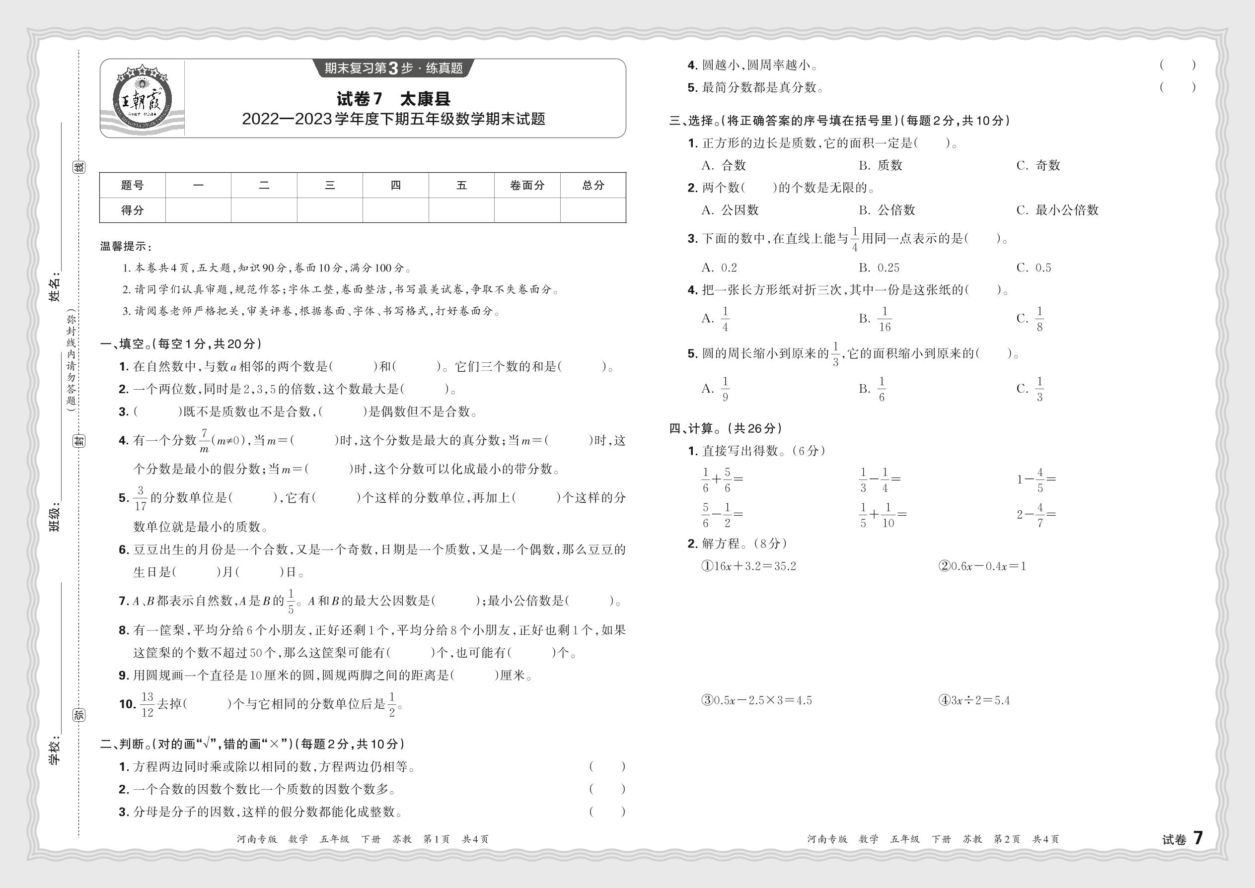河南省周口市鹿邑县2022—2023学年度第二学期五年级数学期末试题(苏教版)【7】