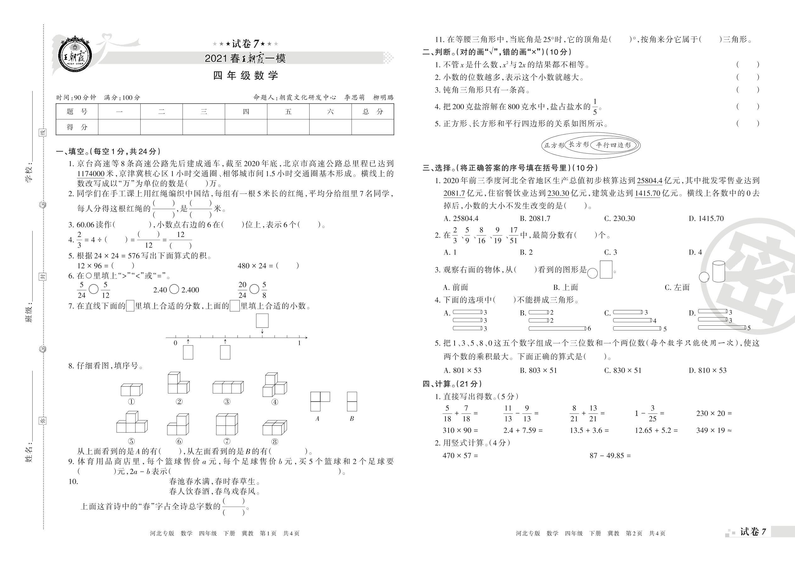 王朝霞期末模拟卷四年级下册数学(冀教版)【7】
