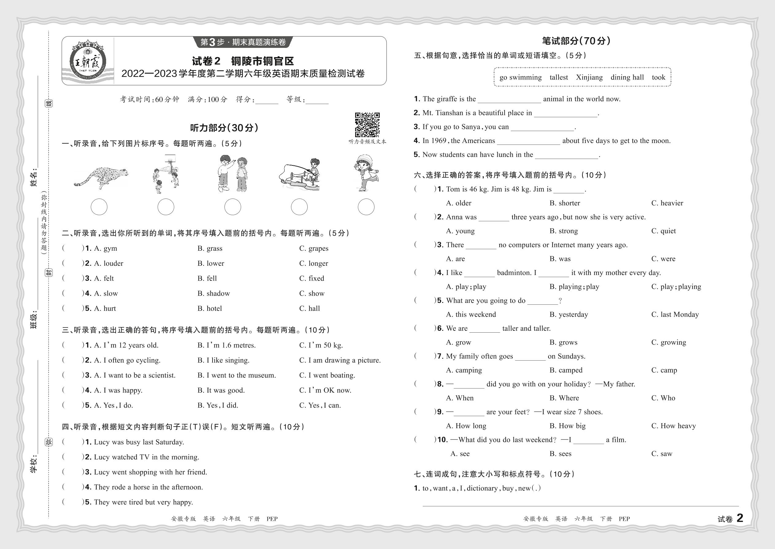 安徽省铜陵市铜官区2022—2023学年度第二学期六年级英语期末质量检测试卷(人教PEP版)【2】