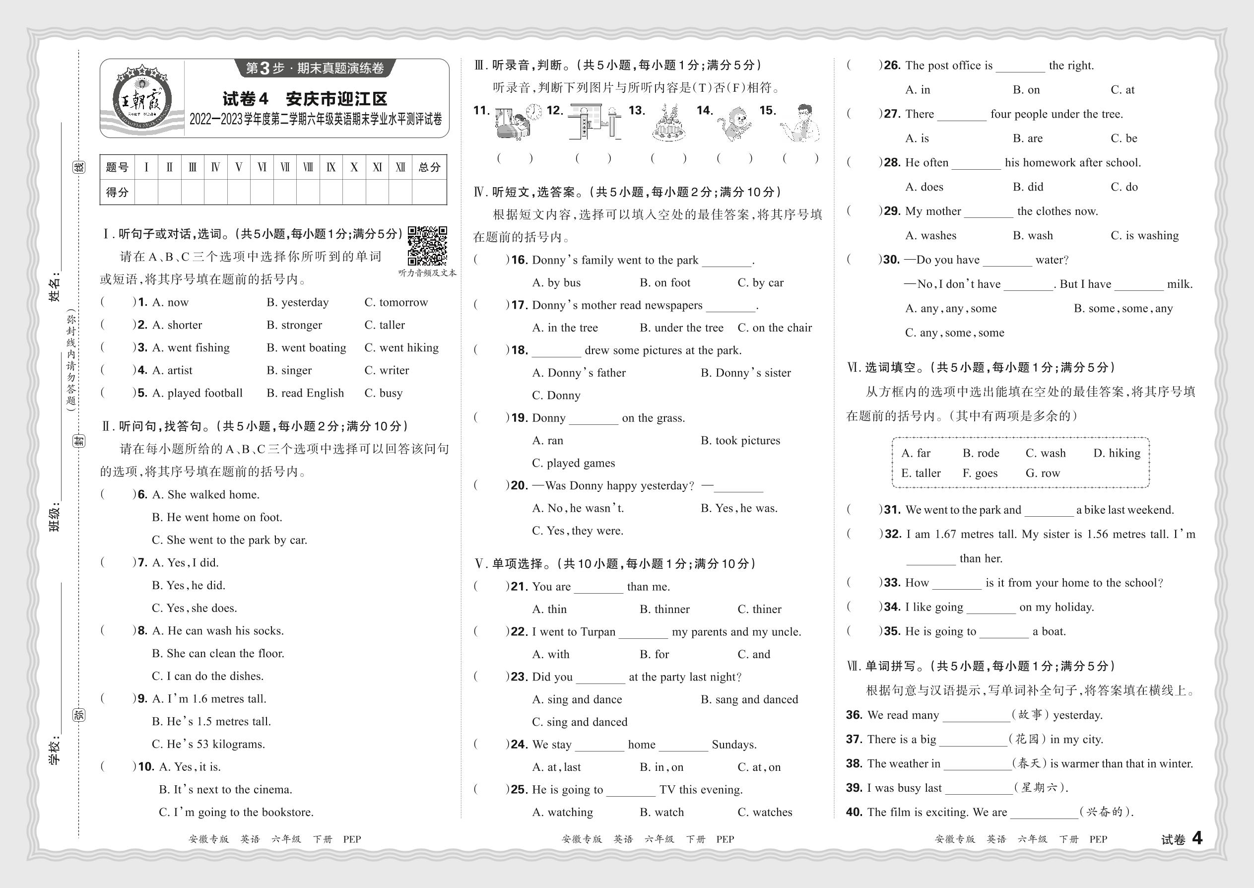 安徽省安庆市迎江区2022—2023学年度第二学期六年级英语期末学业水平测评试卷(人教PEP版)【4】