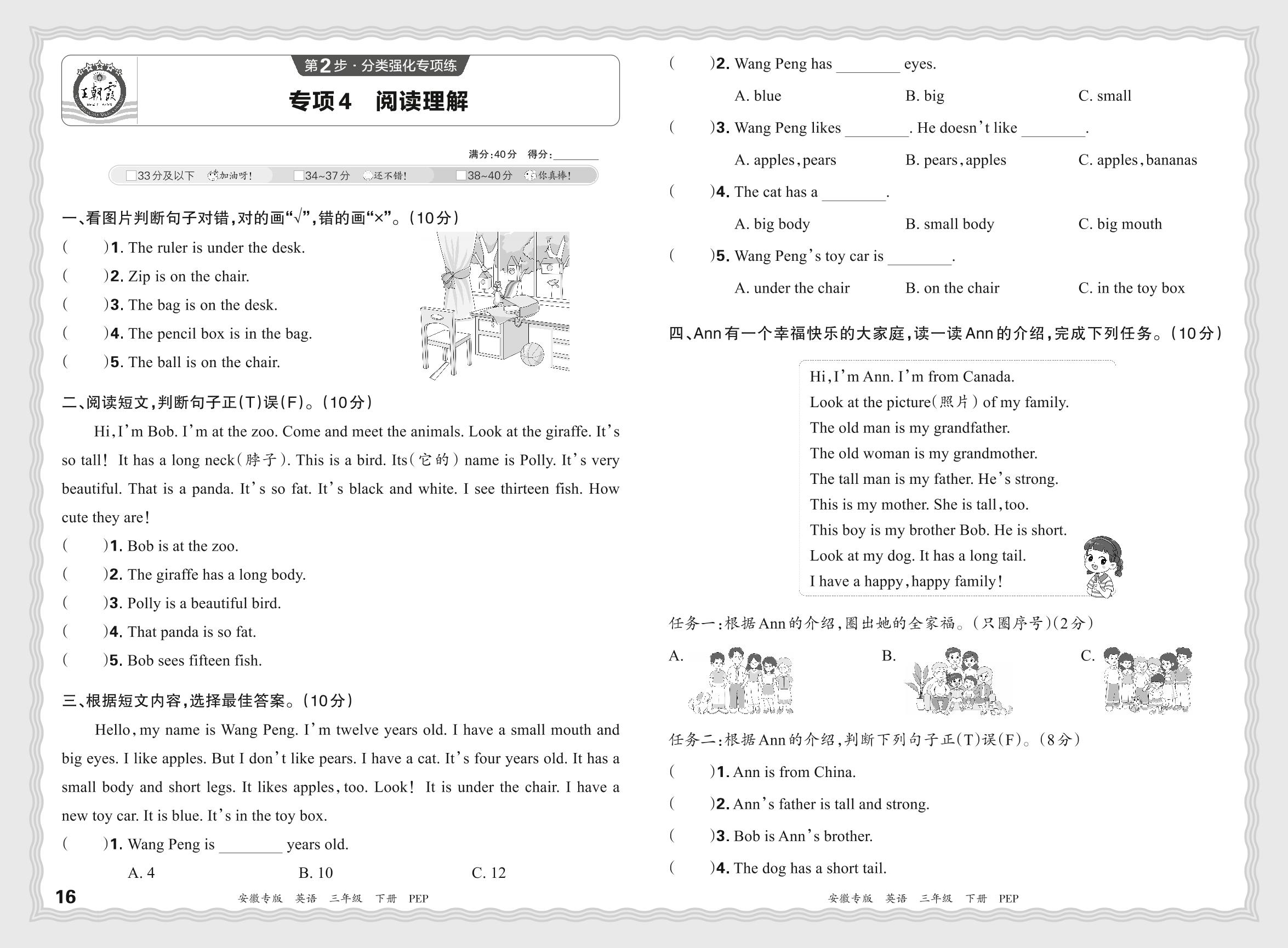 2024春下册三年级英语人教PEP版 期末专项卷安徽版·阅读理解【4】