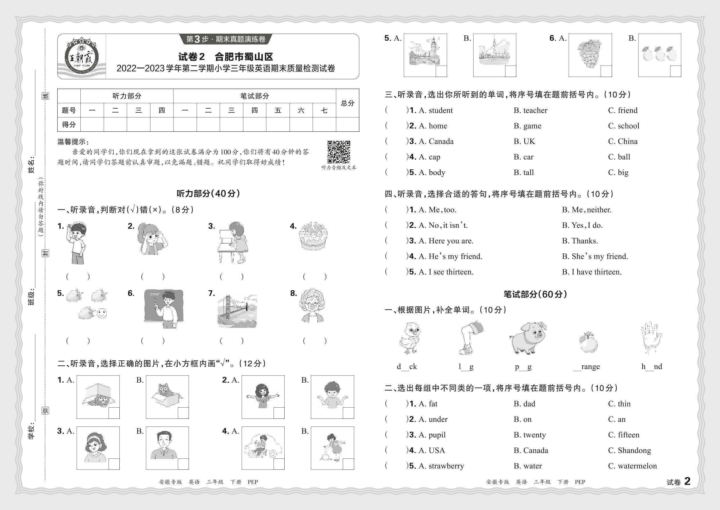 安徽省合肥市蜀山区2022—2023学年第二学期小学三年级英语期末质量检测试卷(人教PEP版)【2】