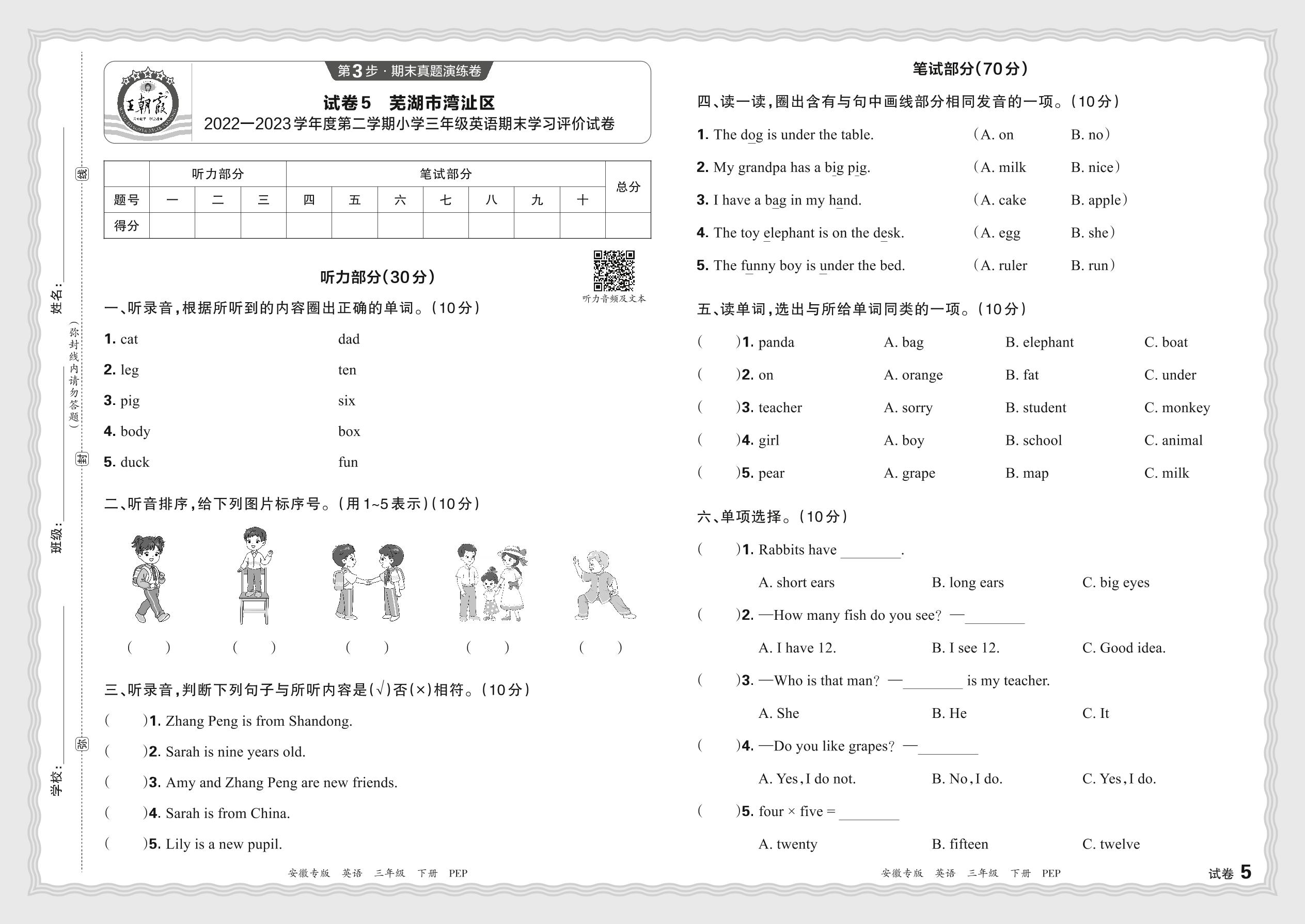 安徽省芜湖市湾沚区2022—2023学年度第二学期小学三年级英语期末学习评价试卷(人教PEP版)【5】