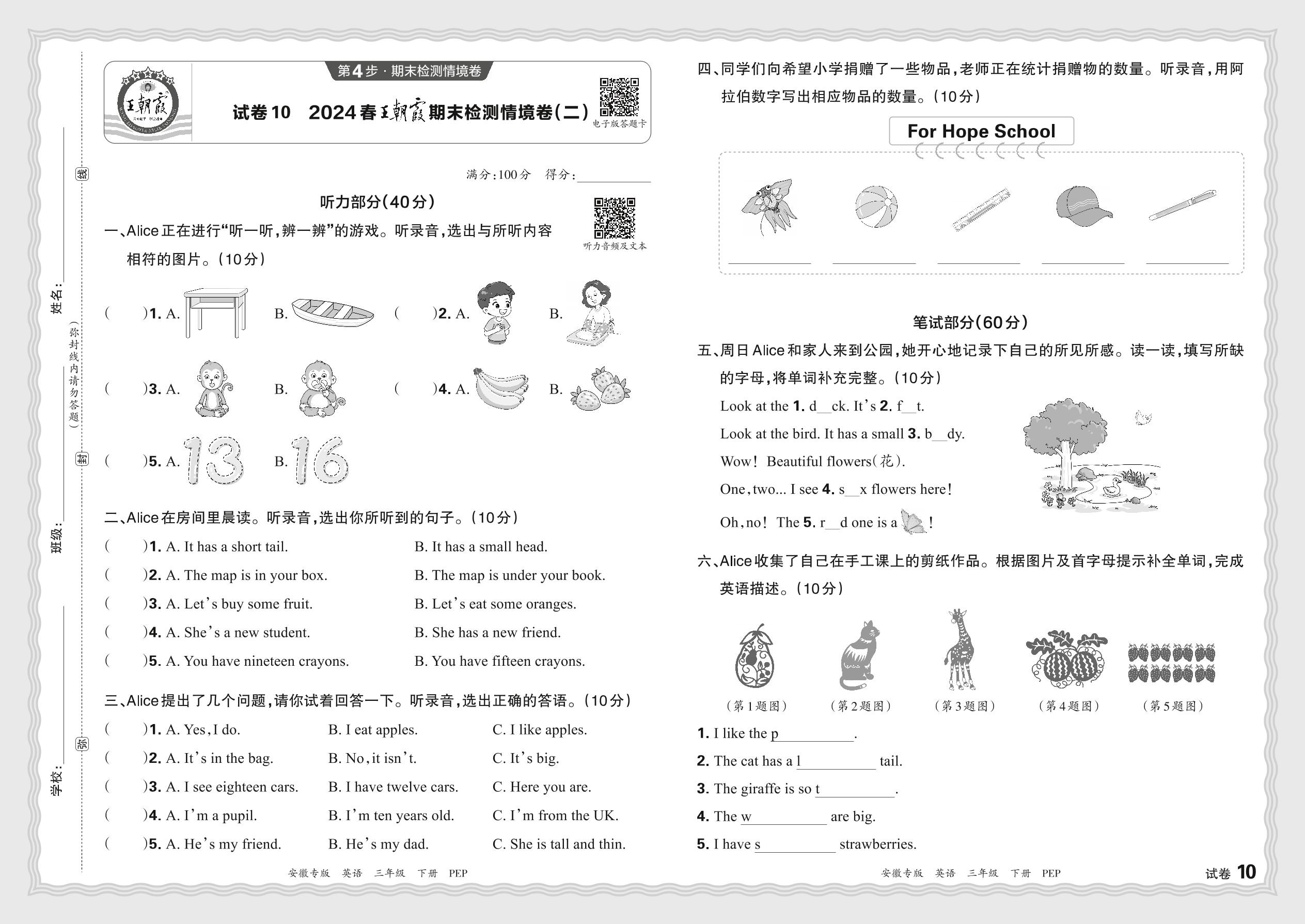 2024春下册三年级英语人教PEP版 王朝霞期末检测情境卷(二)