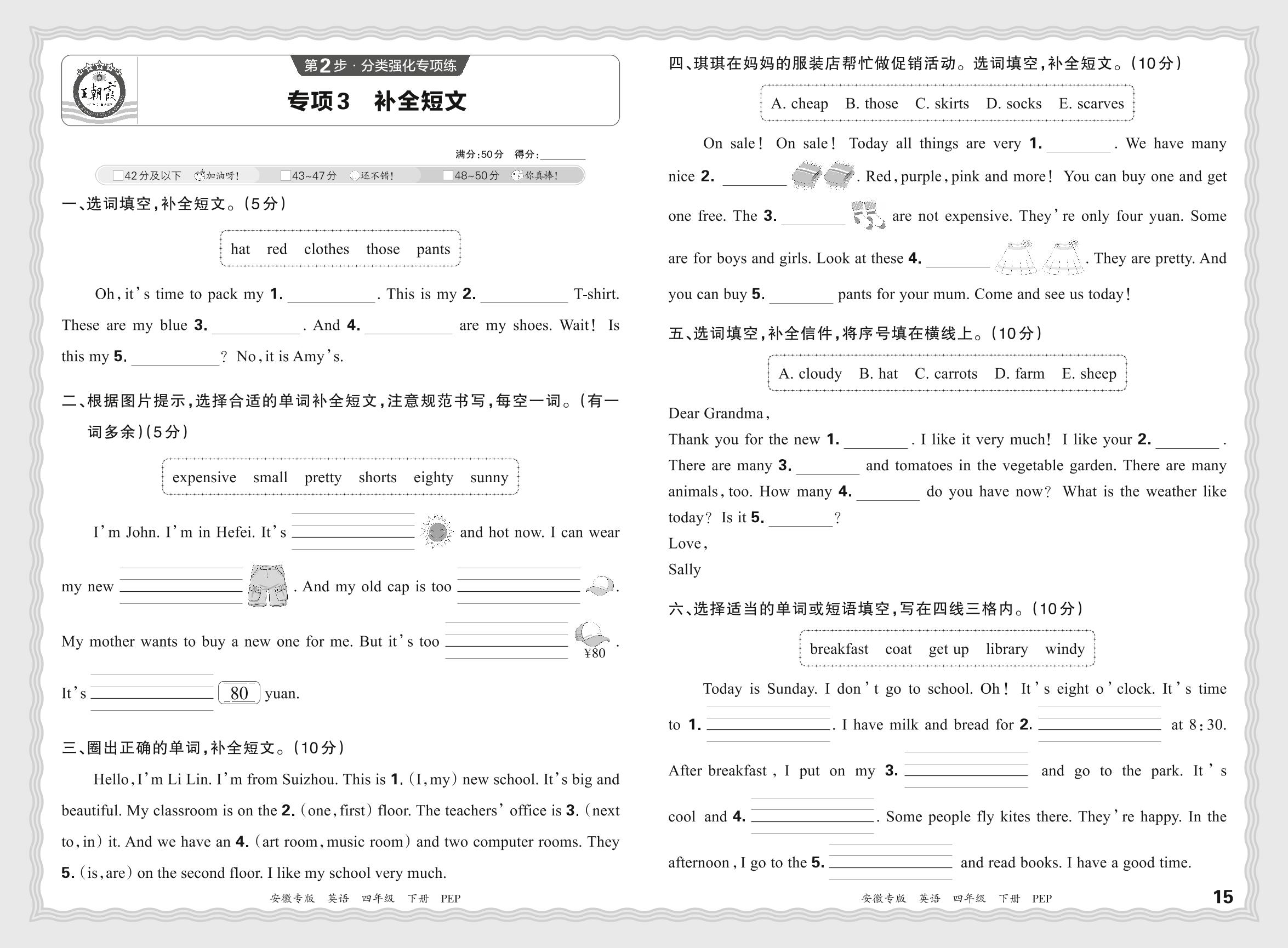 2024春下册四年级英语人教PEP版 期末专项卷安徽版·补全短文【3】