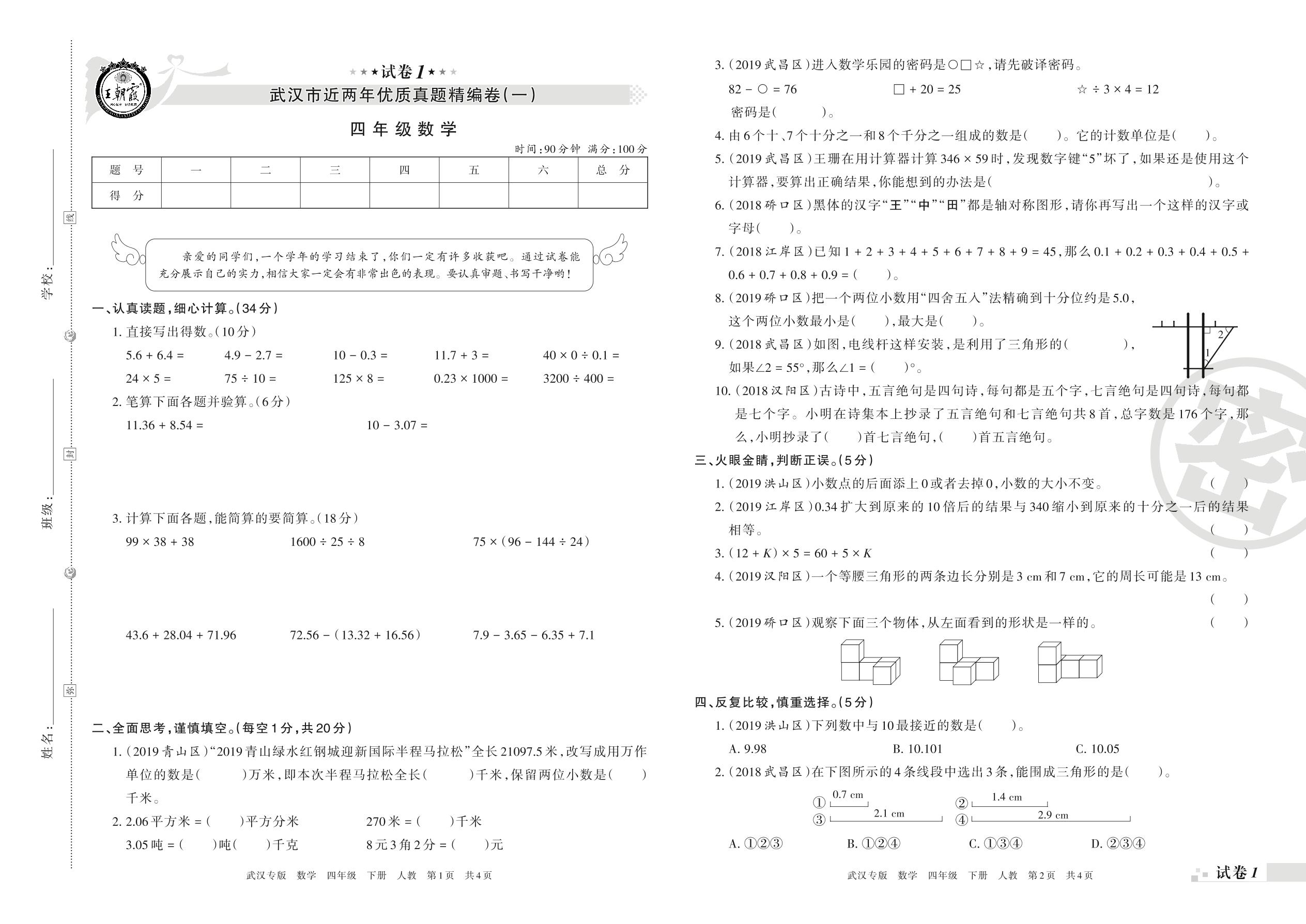 武汉市近两年优质真题精编卷(一)四年级下册数学(人教版)【1】