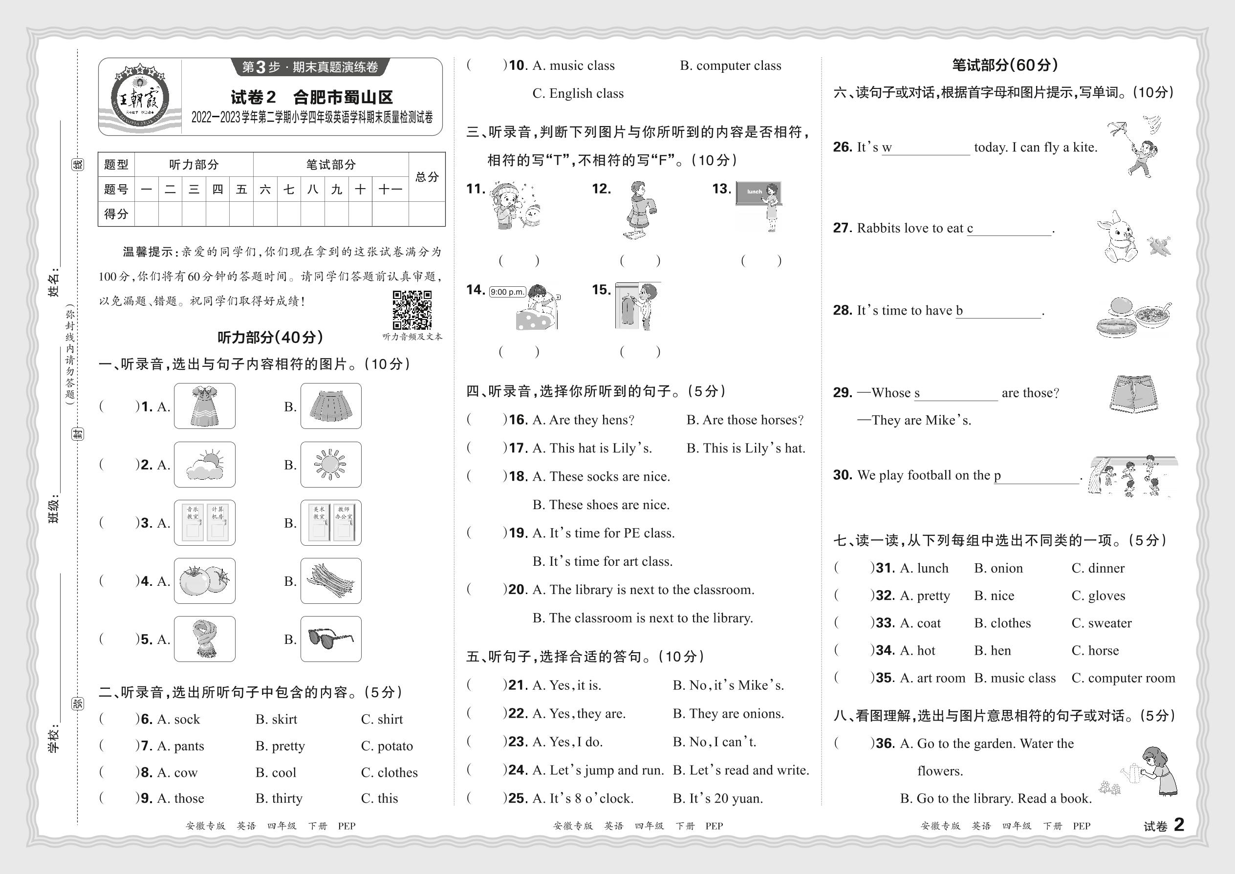 安徽省合肥市蜀山区2022—2023学年第二学期小学四年级英语期末质量检测试卷(人教PEP版)【2】