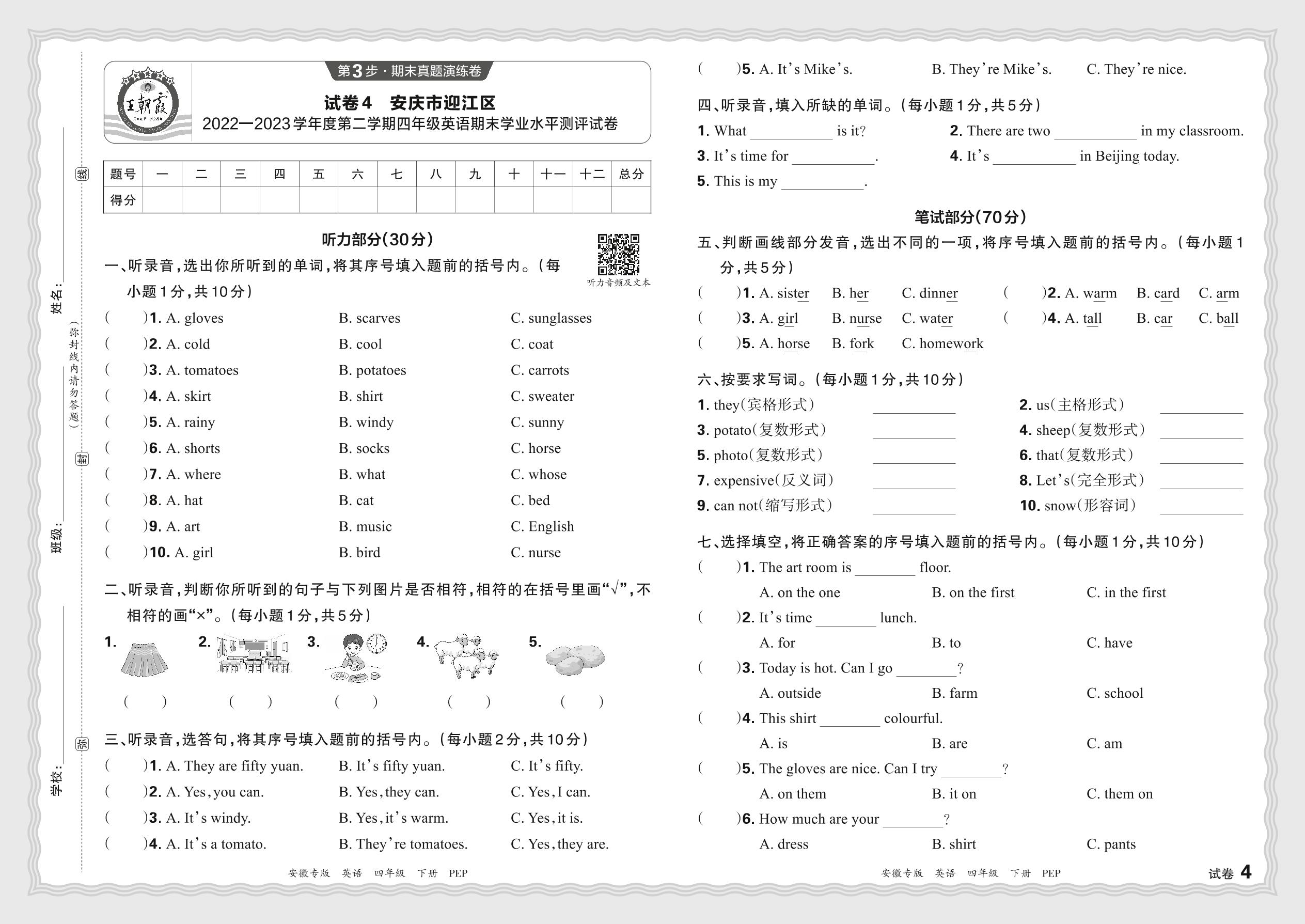 安徽省安庆市迎江区2022—2023学年度第二学期四年级英语期末学业水平测评试卷(人教PEP版)【4】
