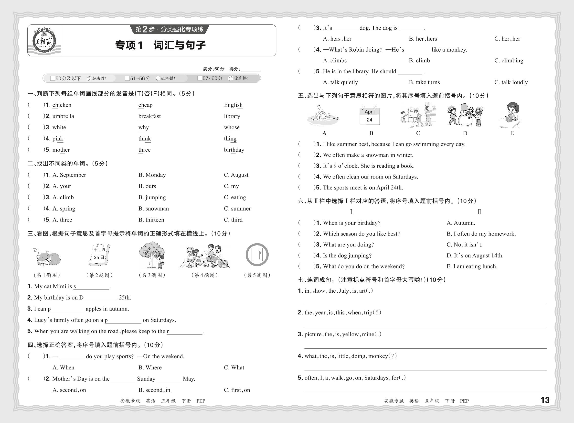 2024春下册五年级英语人教PEP版 期末专项卷安徽版·词汇与句子【1】