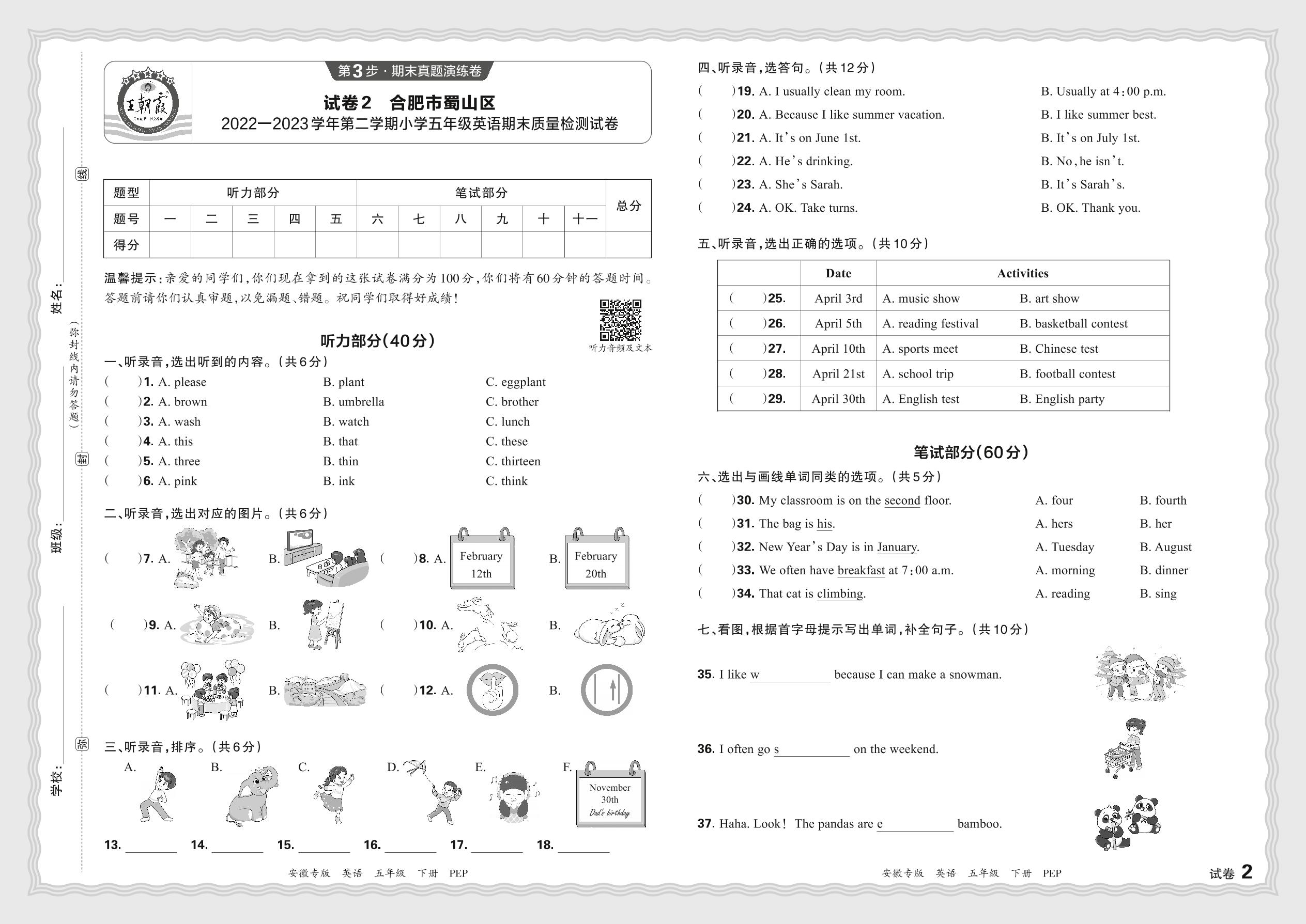 安徽省合肥市蜀山区2022—2023学年第二学期小学五年级英语期末质量检测试卷(人教PEP版)【2】