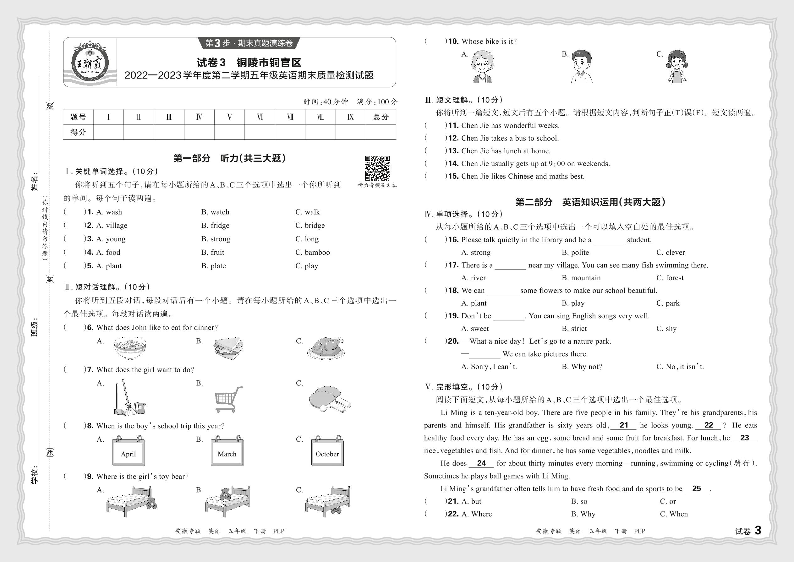 安徽省铜陵市铜官区2022—2023学年度第二学期五年级英语期末质量检测试题(人教PEP版)【3】