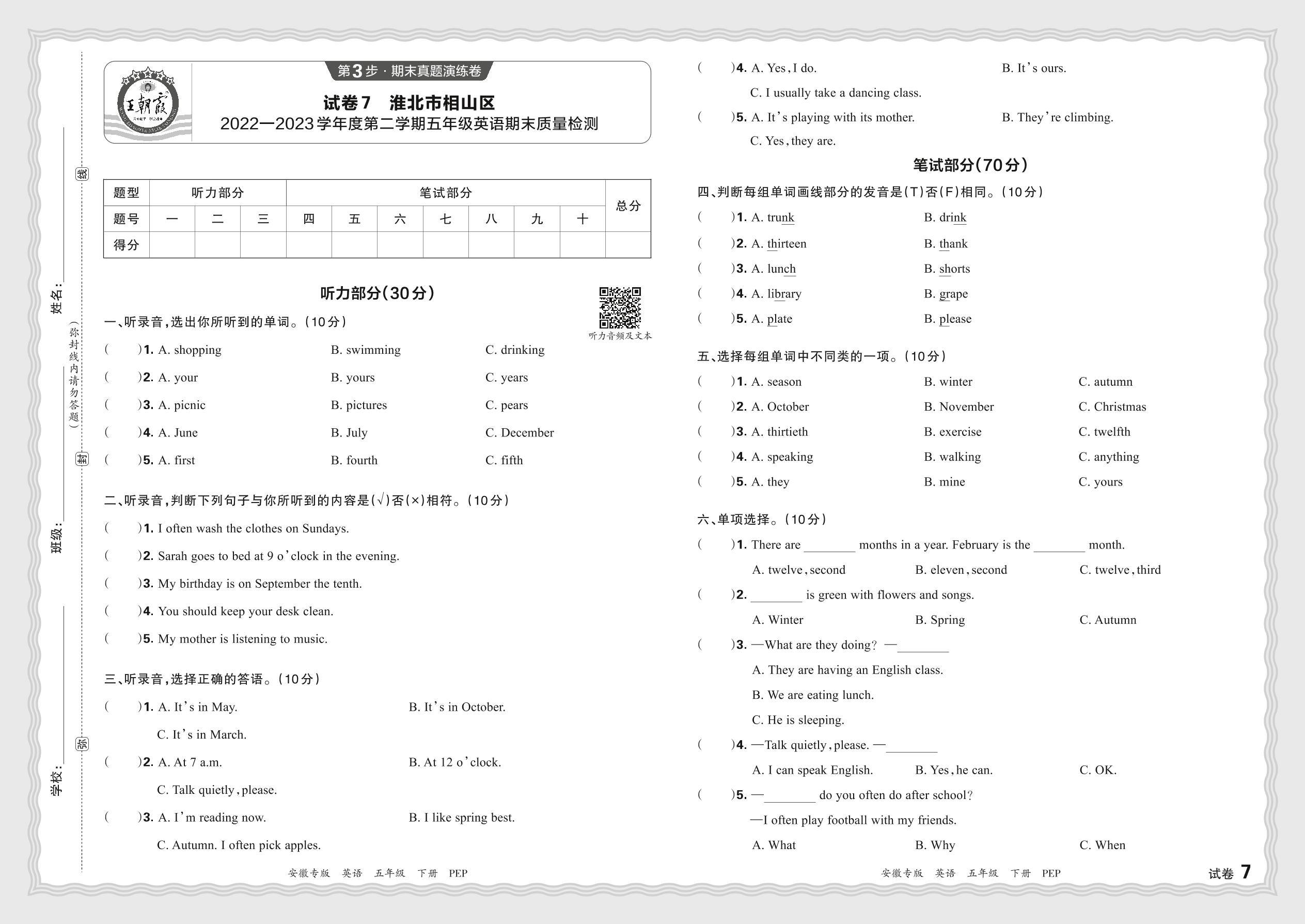 安徽省淮北市相山区2022—2023学年度第二学期五年级英语期末质量检测(人教PEP版)【7】