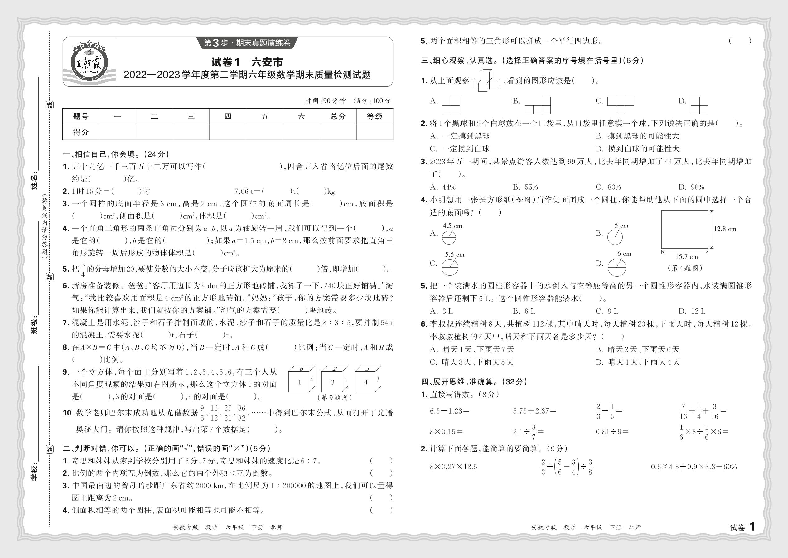 安徽省六安市2022—2023学年度第二学期六年级数学期末质量检测试题(北师版)【1】