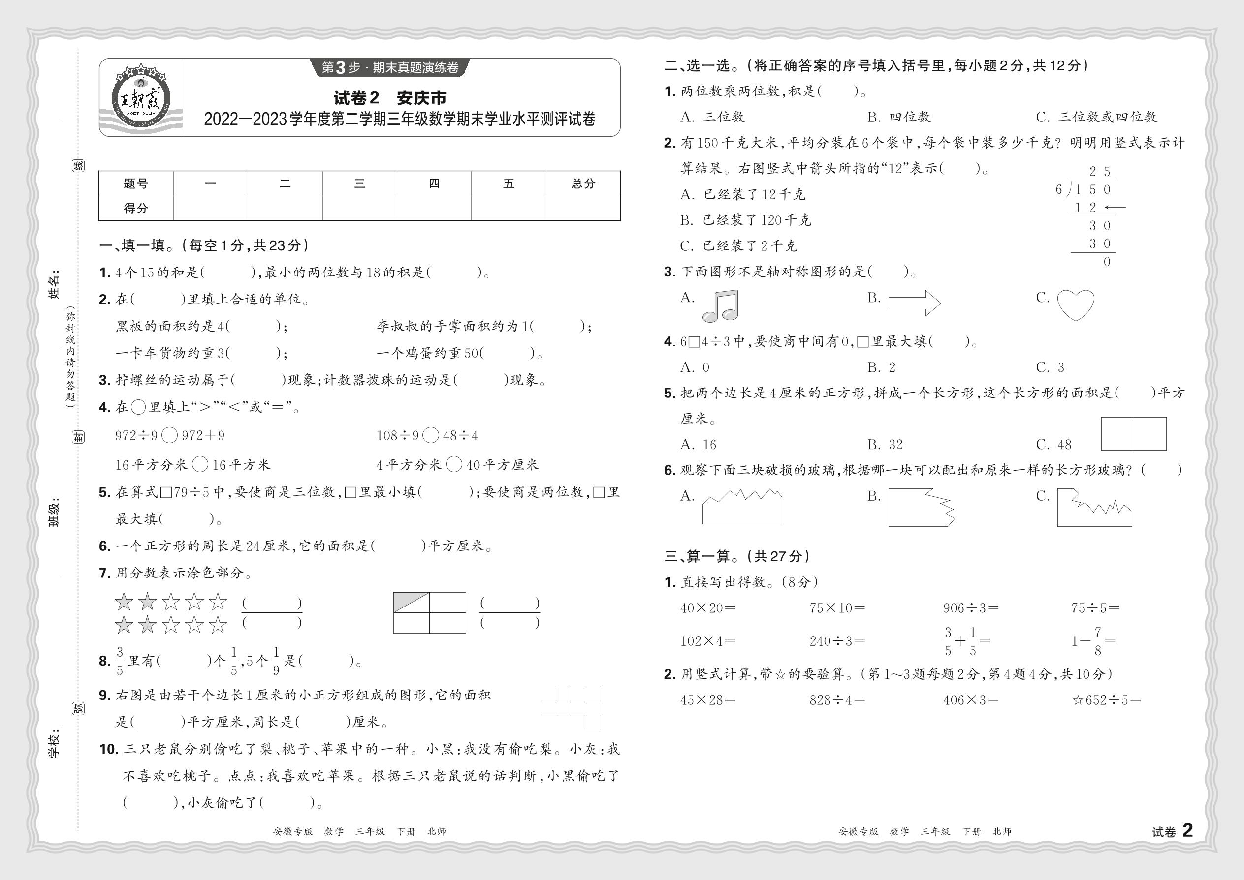 安徽省安庆市2022—2023学年度第二学期三年级数学期末学业水平测评试卷(北师版)【2】
