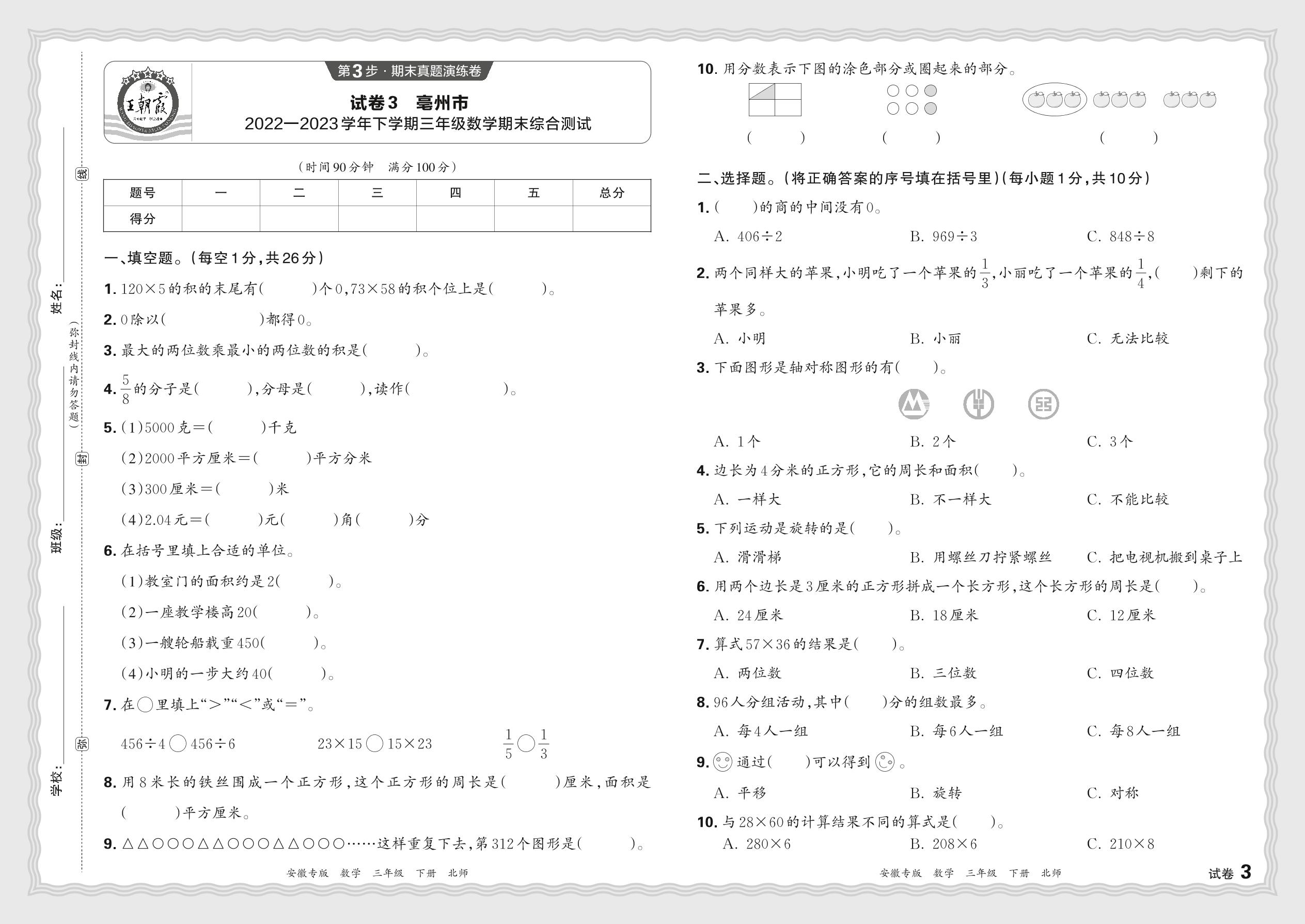 安徽省亳州市2022—2023学年下学期三年级数学期末综合测试(北师版)【3】