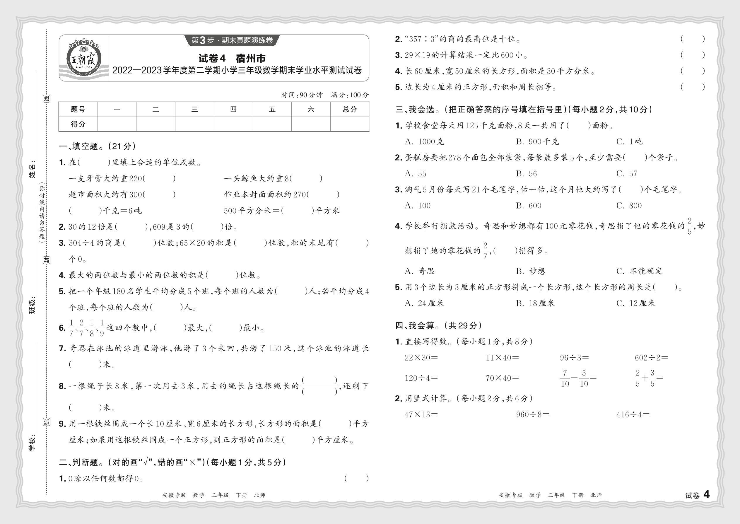 安徽省宿州市2022—2023学年度第二学期小学三年级数学期末学业水平测试试卷(北师版)【4】