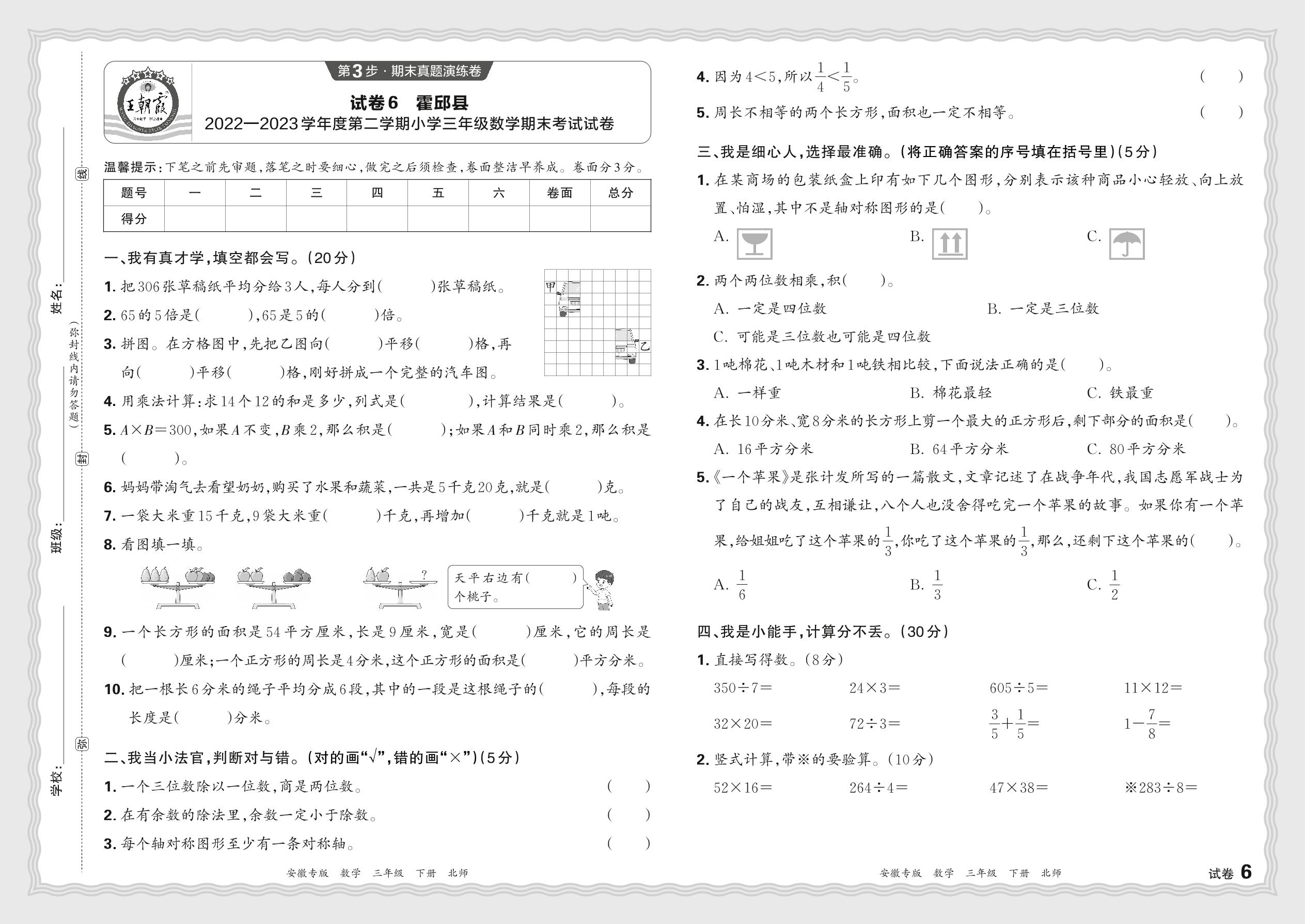 安徽省六安市霍邱县2022—2023学年度第二学期小学三年级数学期末考试试卷(北师版)【6】