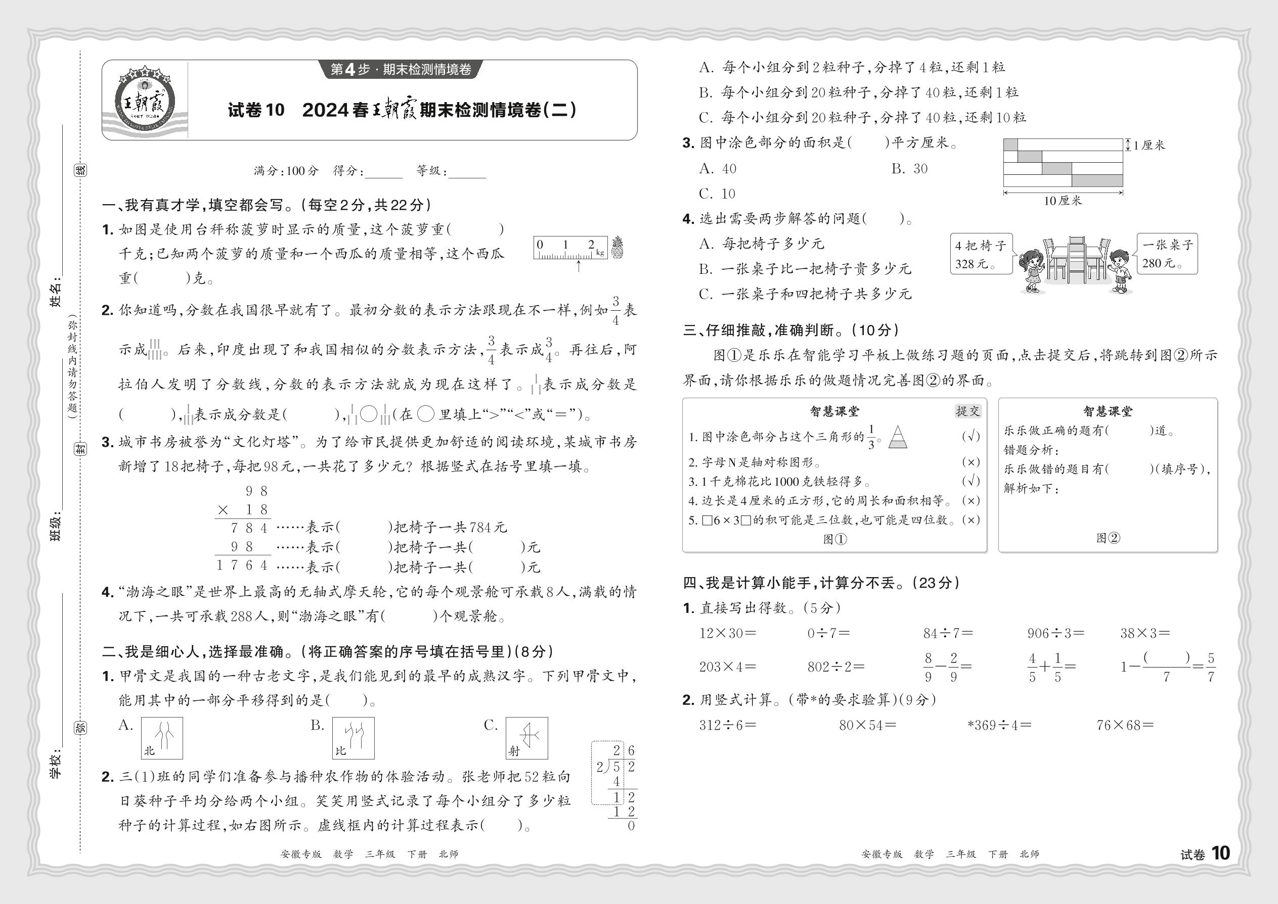 2024春下册三年级数学北师版 王朝霞期末检测情境卷(二)