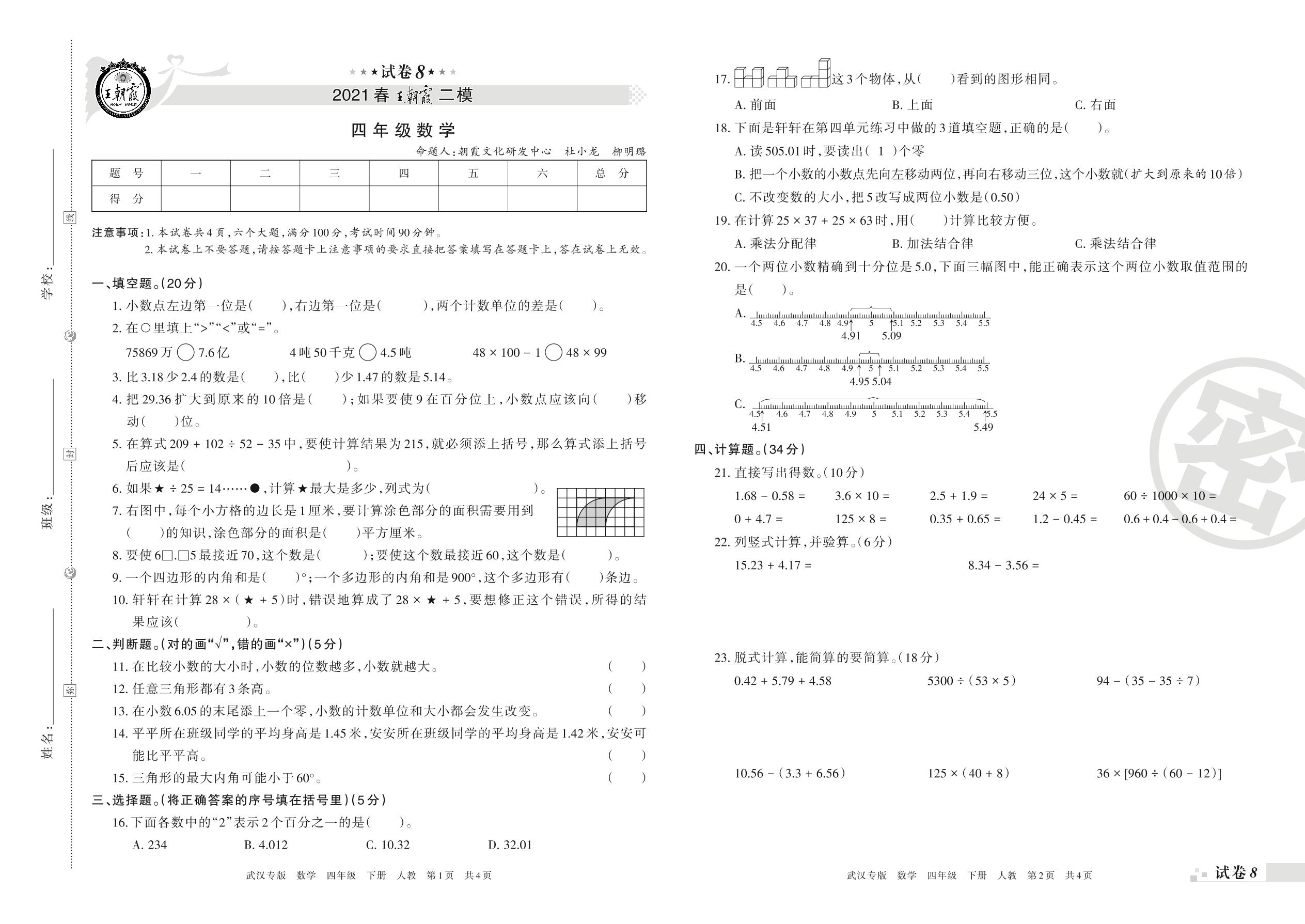 王朝霞期末模拟卷四年级下册数学(人教版)_R210804140006【8】