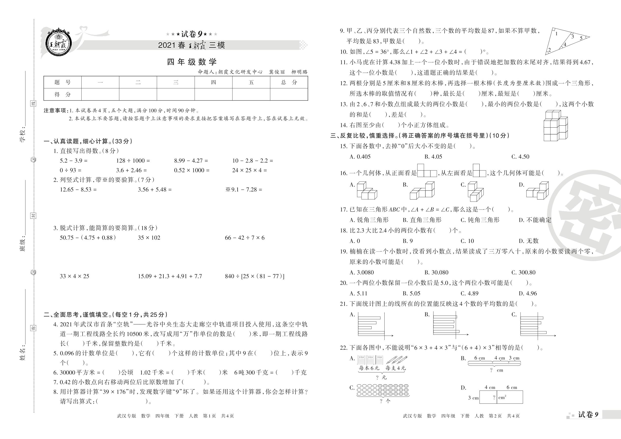 王朝霞期末模拟卷四年级下册数学(人教版)_R210804140008【9】