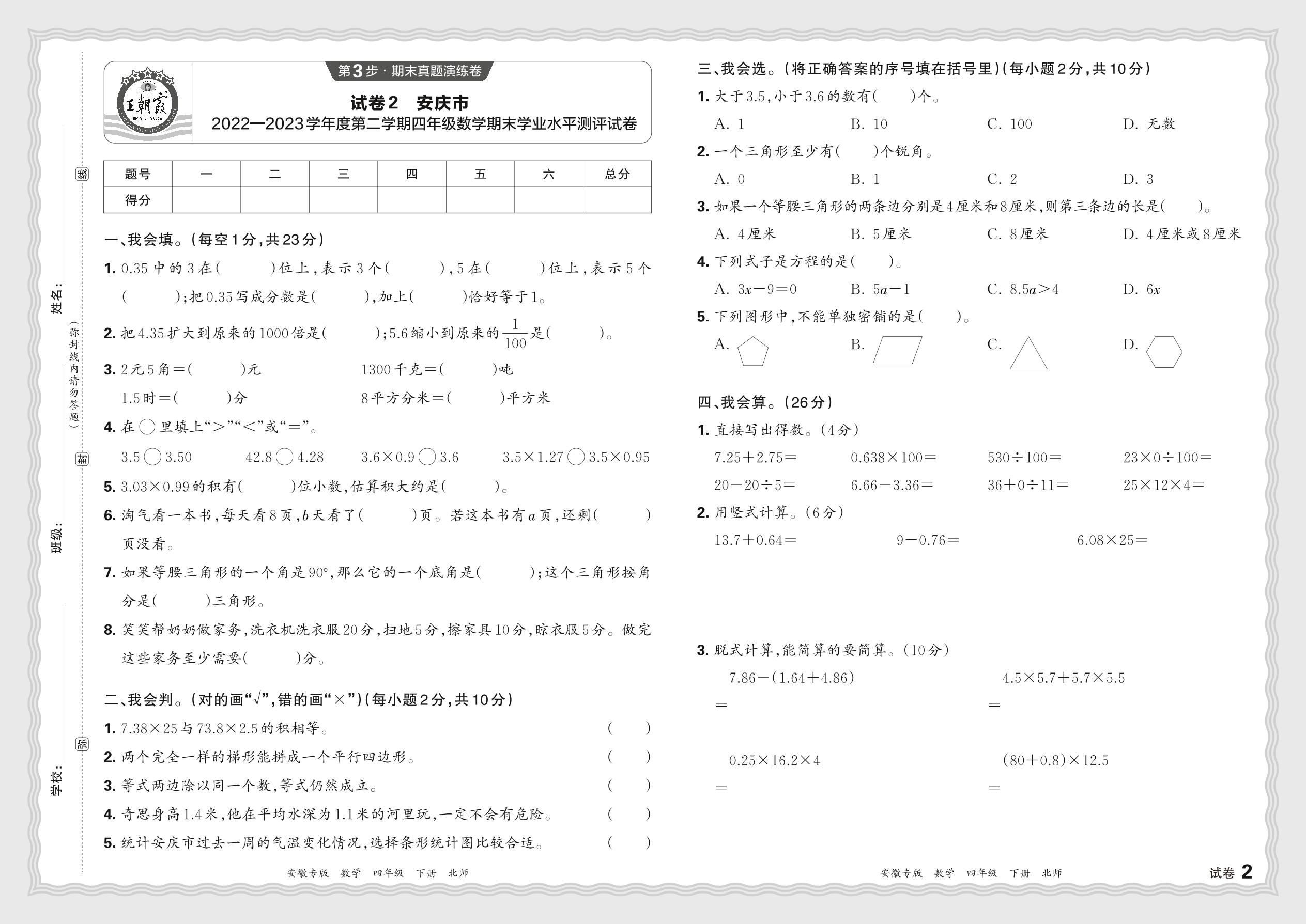 安徽省安庆市2022—2023学年度第二学期四年级数学期末学业水平测评试卷(北师版)【2】