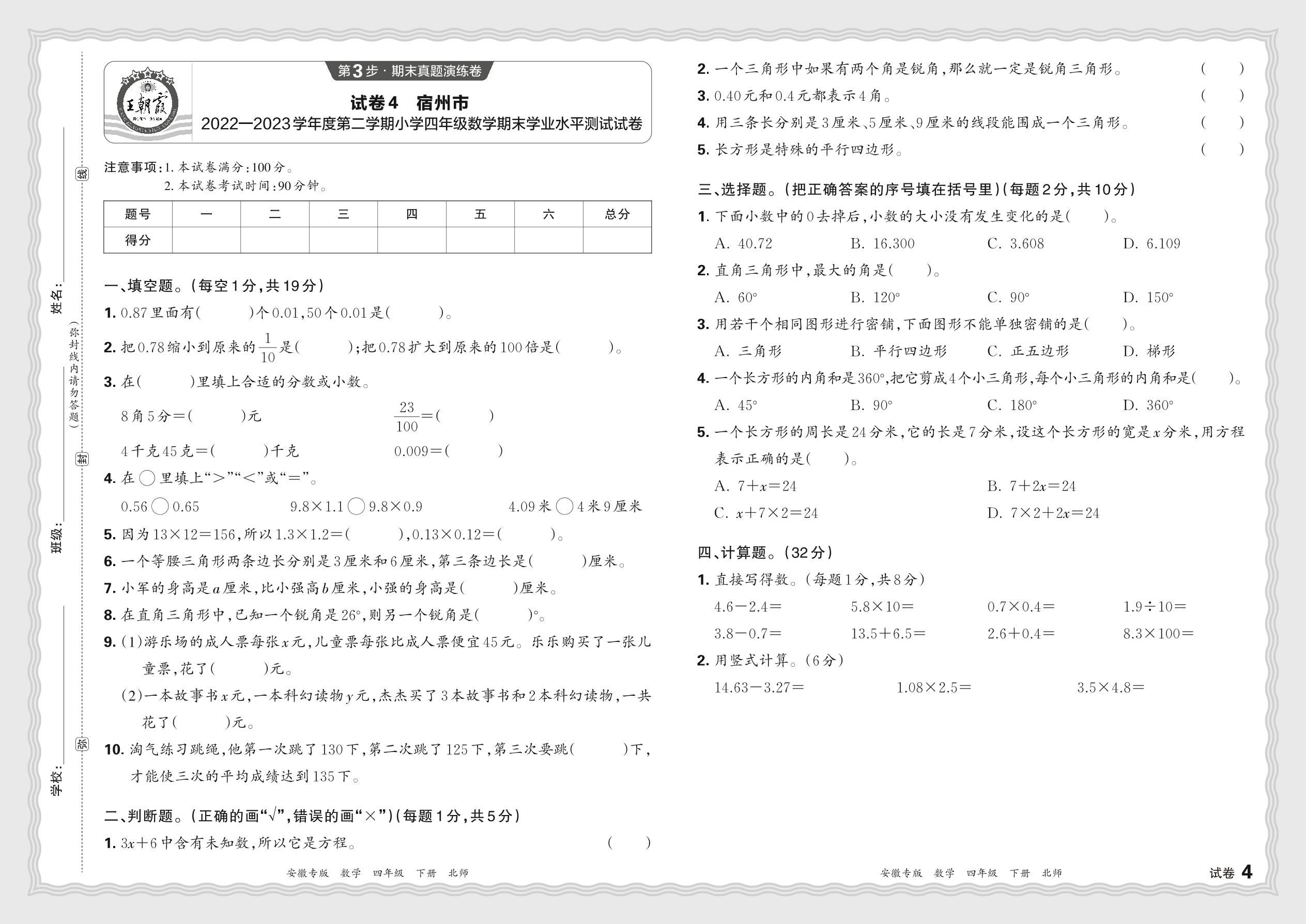 安徽省宿州市2022—2023学年度第二学期小学四年级数学期末学业水平测试试卷(北师版)【4】